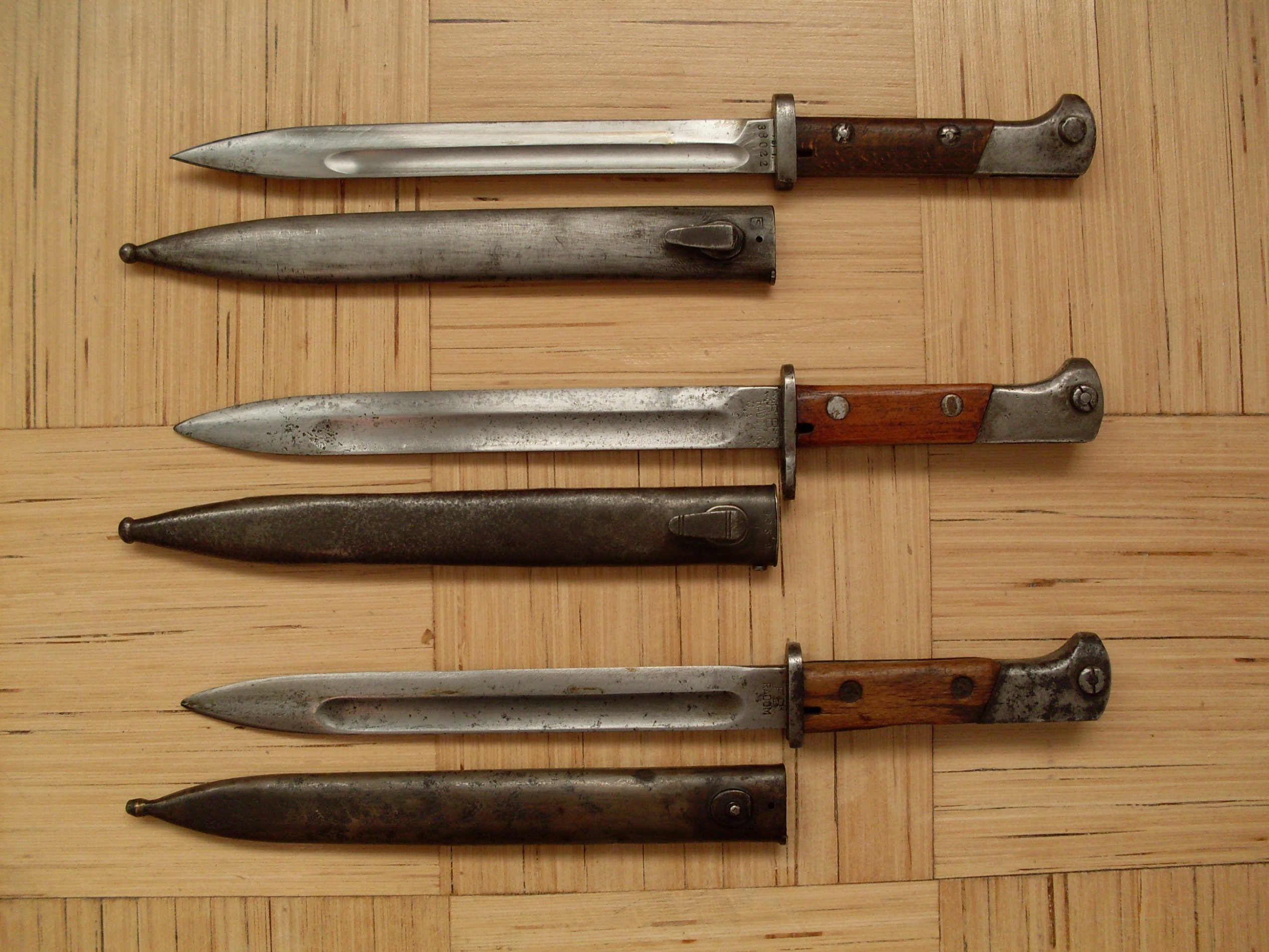 Keskel - hilisem (ja enamlevinud) vz.29 tääk, toodetud poola enda vz.29 tüüpi Mauser-karabiinile, vahetükk on rõngaga (selle täägiga koos on hoopis saksa tupp)