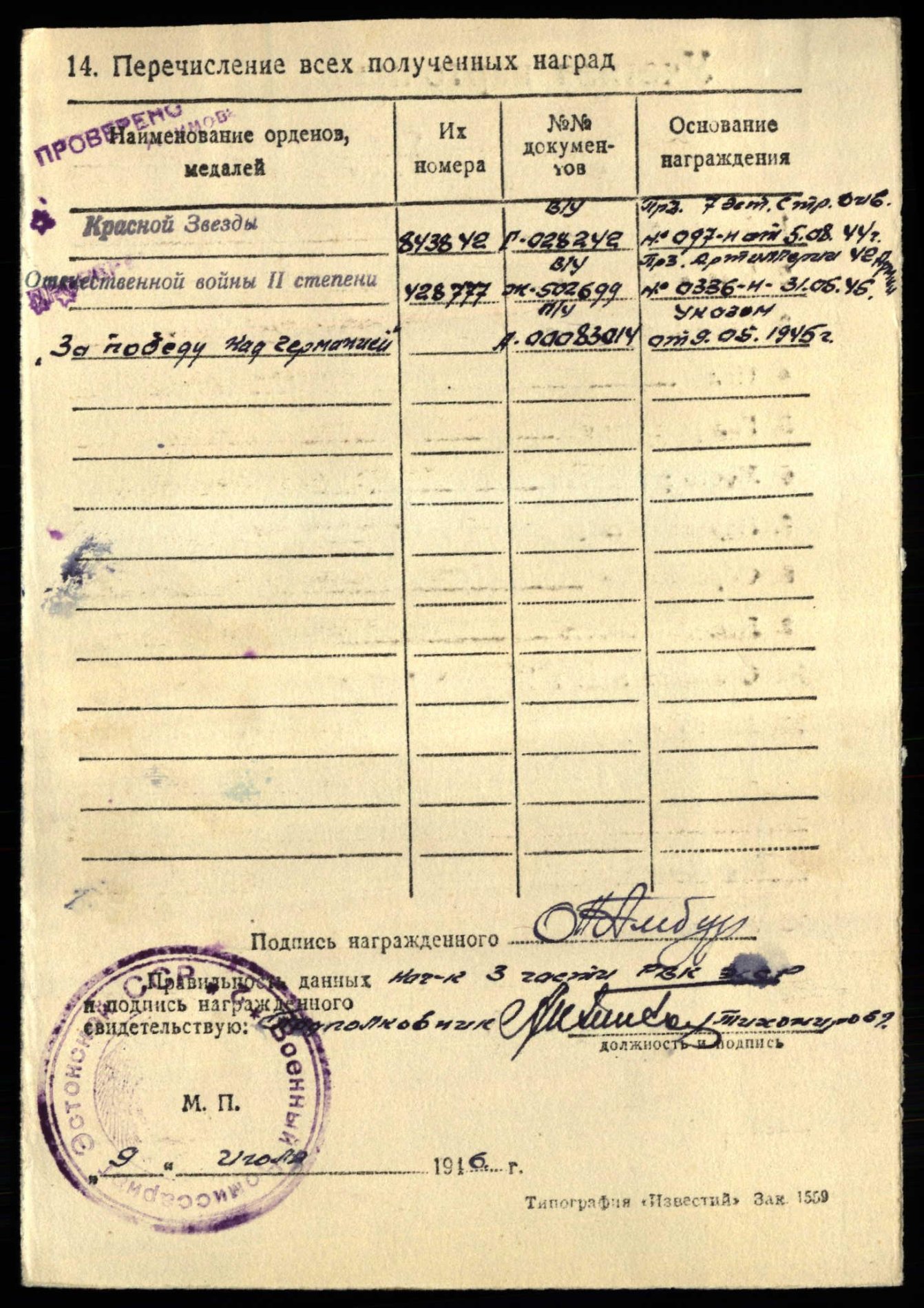 7. laskurdiviisi staabiülema abi- diviisi suurtükiväeülema staabi luureülem leitnant Ott Ambur, Punatähe ordeni nr. 843642 ja Isamaasõja II klassi ordeni nr. 428777 kavaler.