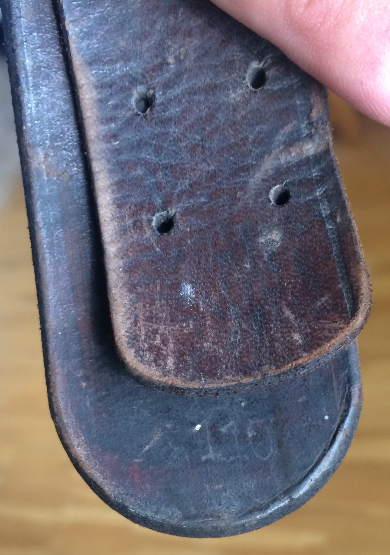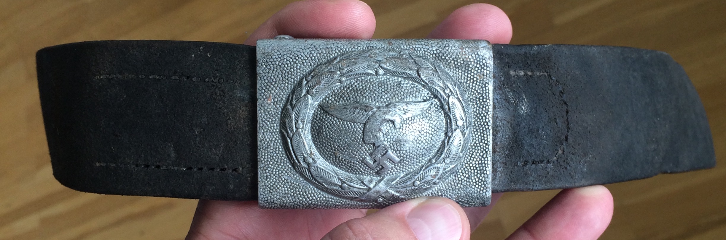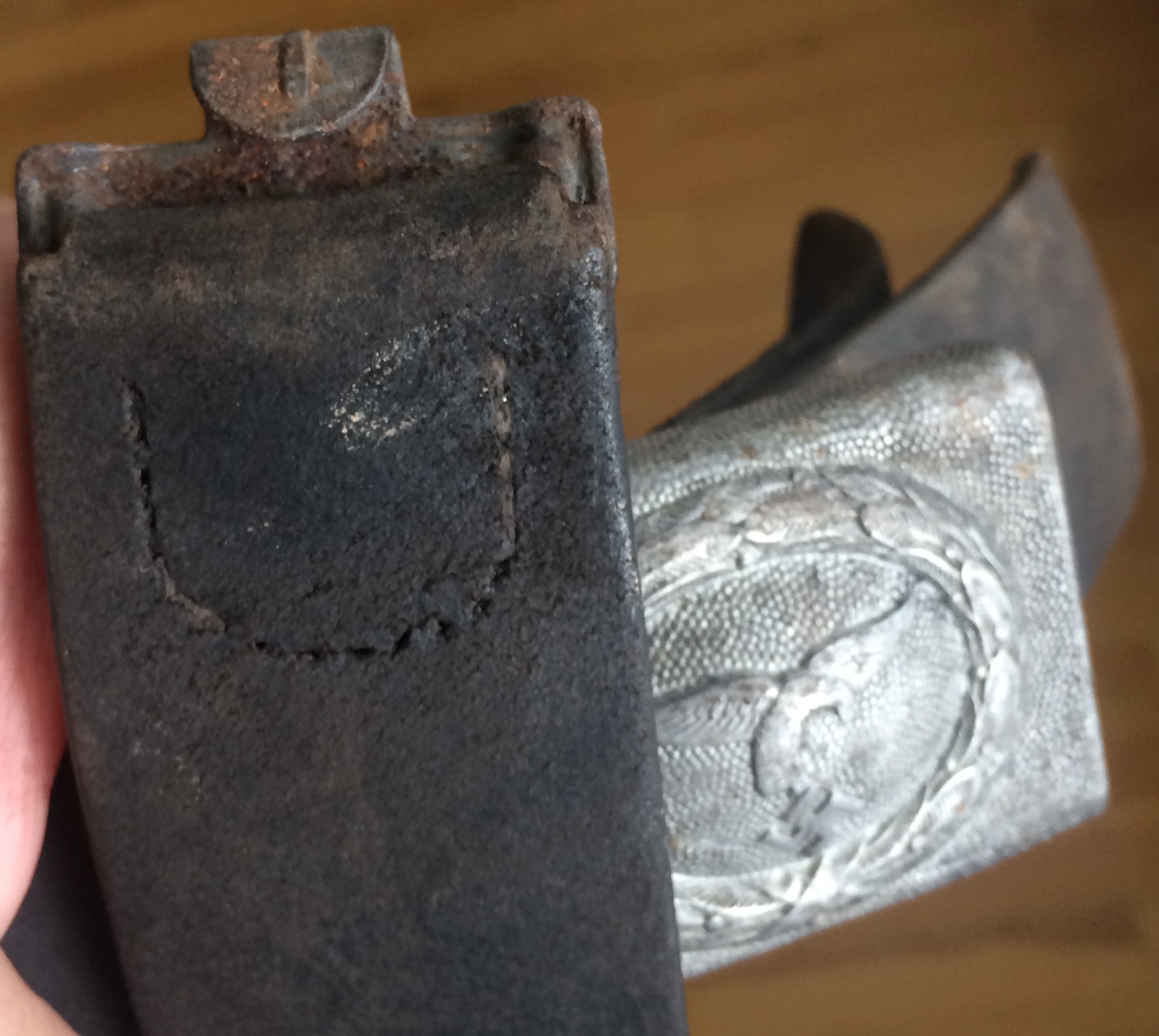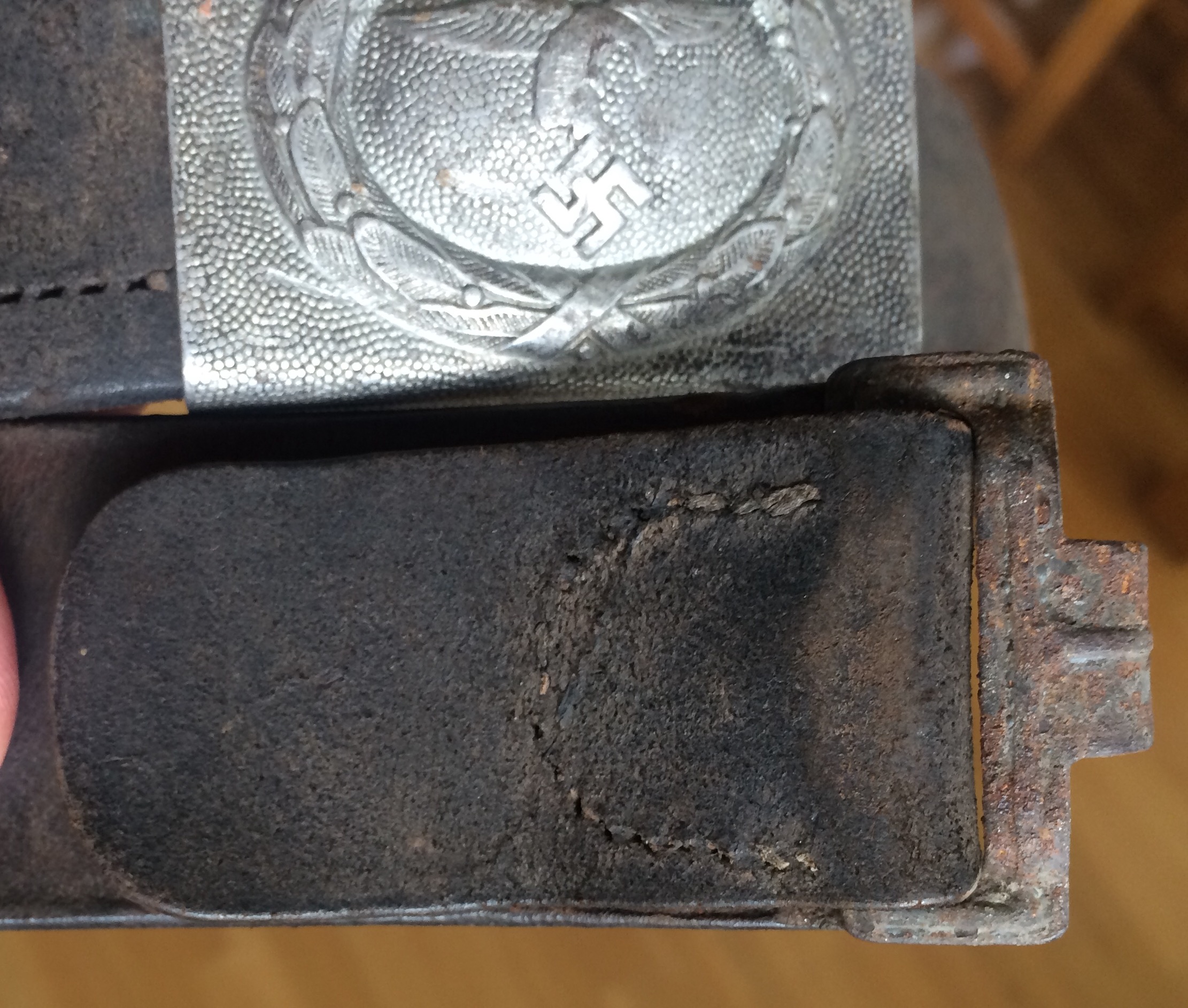 Esimese tüübi LW komplekt, nii nagu leitud omas mahlas. Rihm 110cm, õmblused mädad. Rihm kõva aga täiesti terve ja tundub, et saaks õige hooldusega elule tagasi. Pandla naha õmblused terved, LBA märgistusega ja 1936a markeering. Haruldane, 200.-