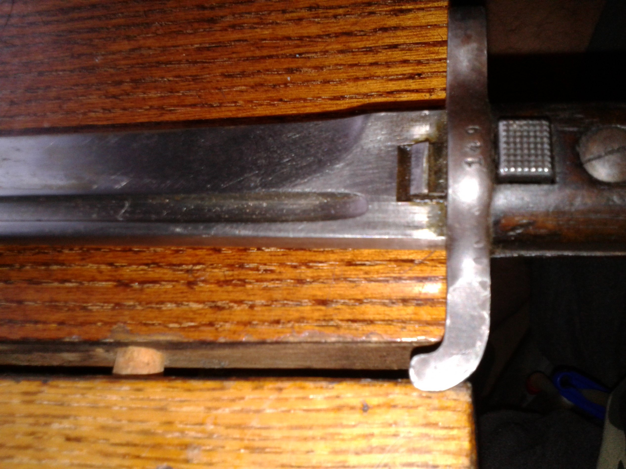 üleval -- Briti SMLE karabiini torketäägi esimene, 1939.a pärit nelikantteraga mudel. Socket´il on kirje GR krooniga keskel(-Georgius Rex), siis täägi mudeli kirje No4 MkI (sama kirje on ka tupe kõril) ja tootjamärgis S_M(-Singer Manufacturing). Komplektis on kitsale tupele sobitatud briti standardrihmakinnitus, mille tagaküljel on tempelkirjed.