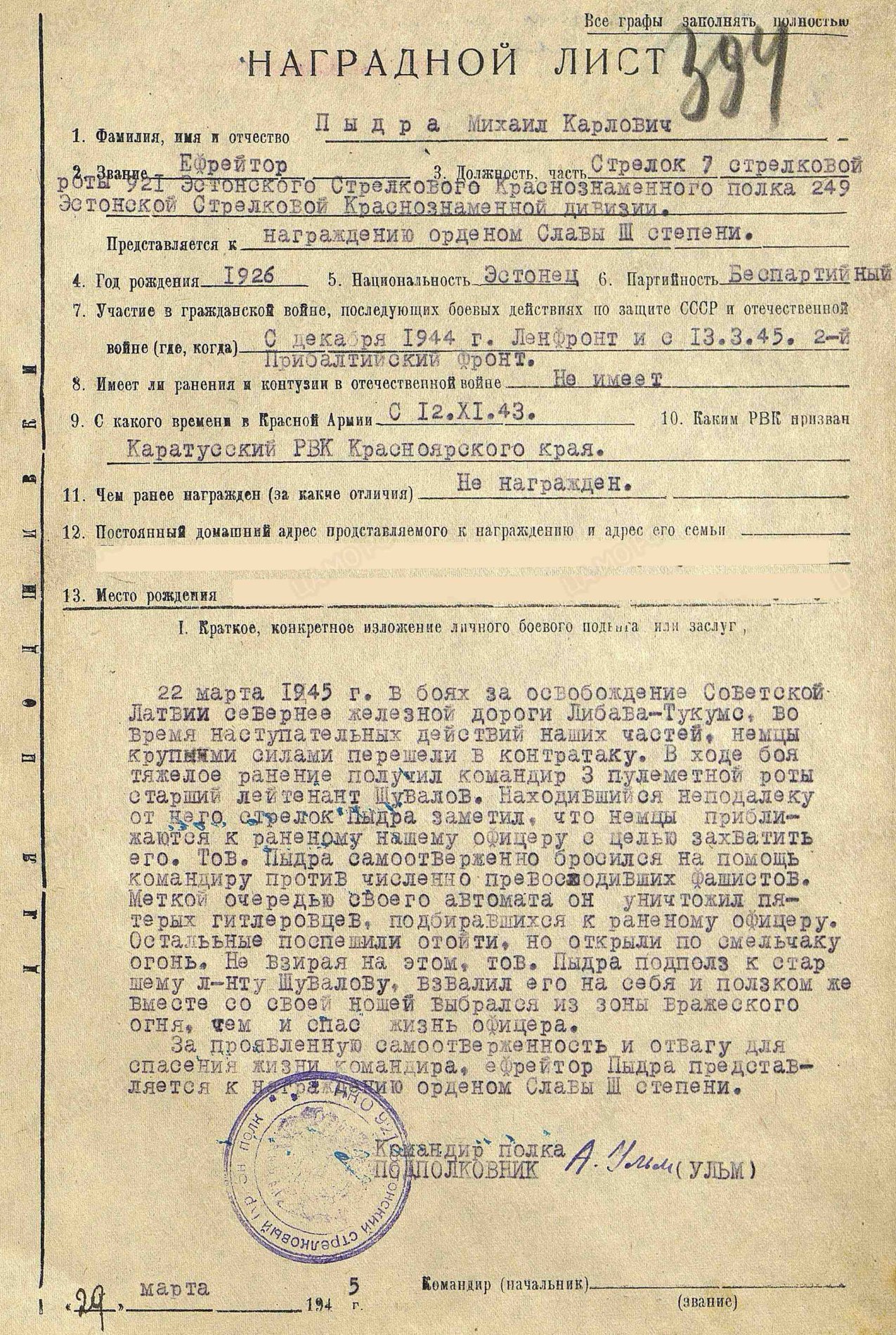 Eesti Korpuse 249. laskurdiviisi 921. polgu jefreitori Mihkel Põdra Kuulsuse ordeni III järk (293253).