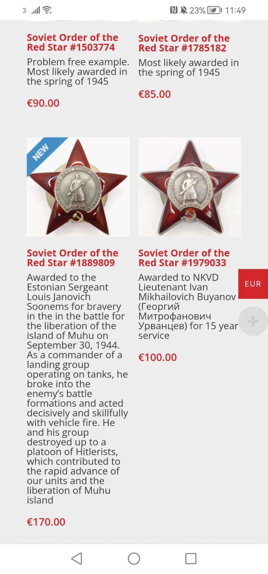 Eesti tankisti punatäht müügis, Muhu operatsiooni eest. Hind on kah muidugi ilus...