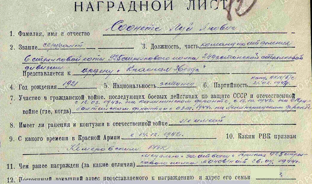 Minu meelest täitsa oma hinda väärt, huvitav autasustamine ju. Aga ta ei olnud tankist. Seersant Lui Soonets oli 925. laskurpolgu 6. laskurroodu jaokomandör. Punatähe ordeni nr. 1889809 sai selle eest, et 30.09.1944 olles dessantgrupi komandör tungisid tankidel liikudes Muhu saare lahingutes läbi vastase kaitseliini. Otsustavalt ja targalt tegutsetses hävitasid oma grupi automaatide tulega ligi rühma jagu vastaseid, millega aitasid kaasa vägede edasisele liikumisele ja sellega ka kogu Muhu saare vabastamisele.