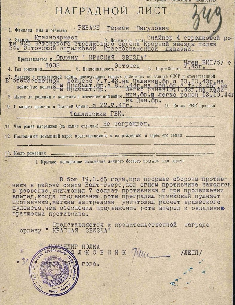 Punatähe orden nr. 1999515, autasustatud punaväelane Herman Rebase, 925. laskurpolgu 4. laskurroodu snaiper.