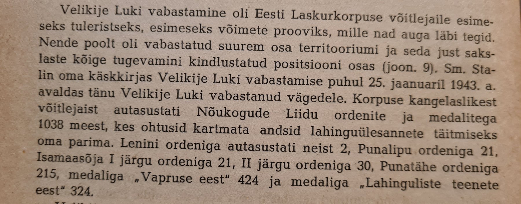Leidsin üles selle raamatu, kus need numbrid kirjas - see on kohe peale sõda, 1945. aasta suvel kokku pandud "Eesti Tallinna Kaardiväe Laskurkorpuse võitlustee". Kuna see raamat on juba 1945. aasta oktoobris trükki läinud siis seal ei saa olla kuidagi neid hilisemaid, Velikije Luki lahingute eest tagantjärgi antud autasusid.