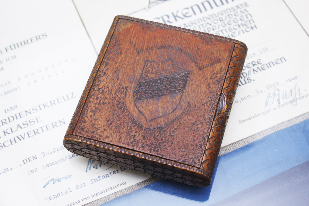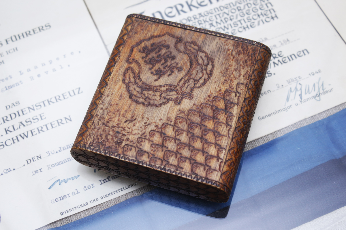 Vinge jah! Mis lugu selle puidust portsigariga on, kas kaevikukunst vms? Mul enda vanaisast järel analoogne aga sees oli paberosside asemel väike saksa-eesti sõnaraamat.Teenis ta 6. Piirikaitserügemendis.