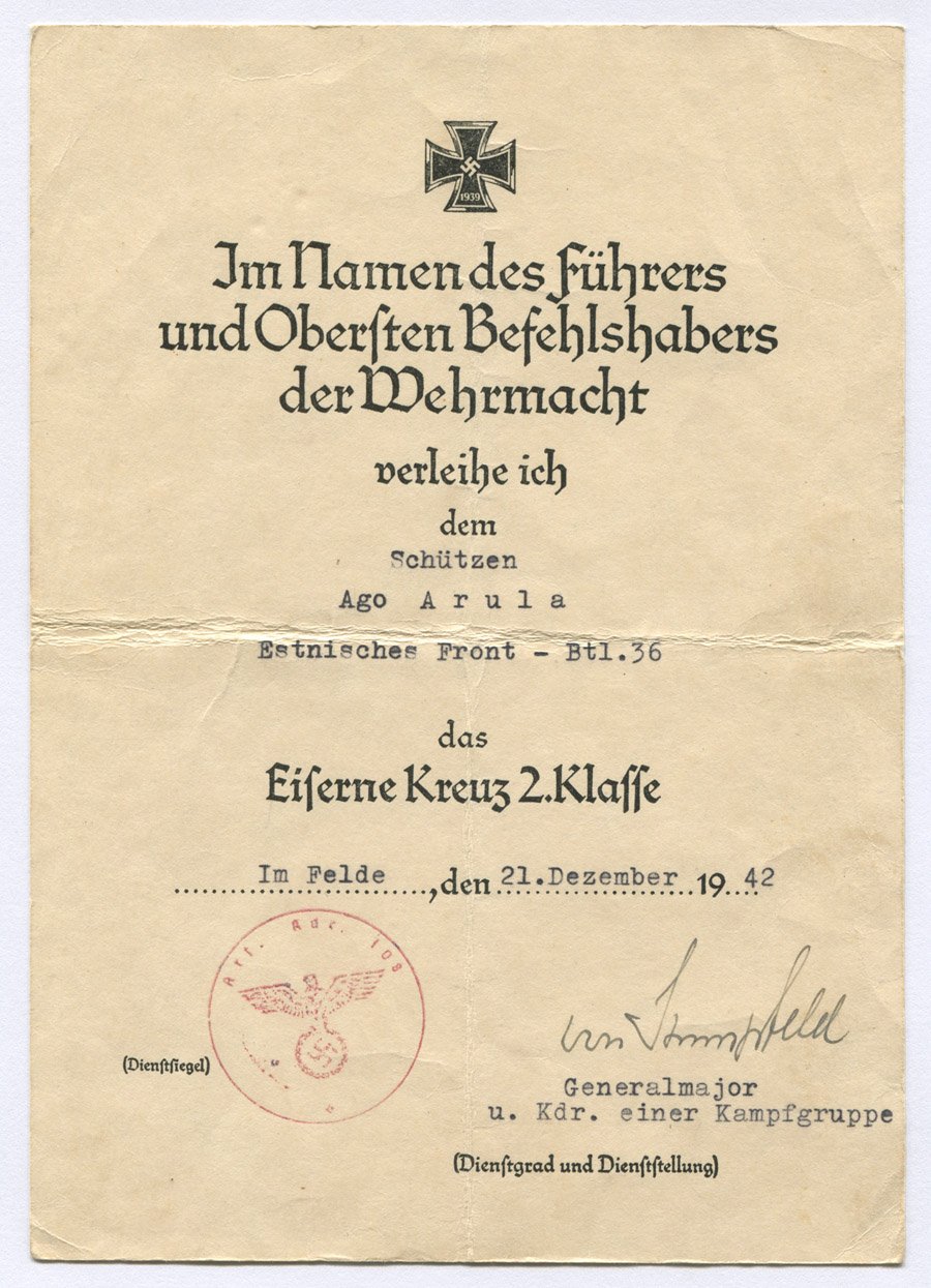 36. Politseipataljoni 3. kompaniis teeninud ja Surovikino lahingutest osa võtnud reavõitleja Ago Arula Raudristi 2. klassi tunnistus. Dokumendile on alla kirjutanud Kampfgruppe Stumpfeld ülem kindralmajor Hans-Joachim von Stumpfeld.