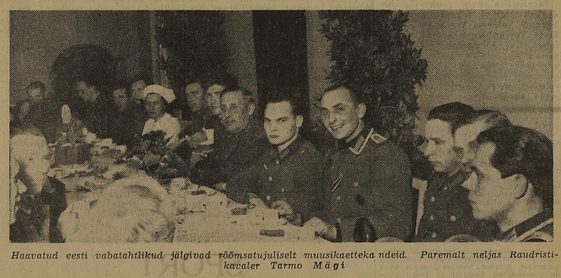Vabatahtlike ühtlases välihallis peres äratab tähelepanu naeratlev noormees, kes kannab rinnas Raudristi linti ja rünnakumärki. Küsitlemisel selgub, et see heatujuline rindesangar on 27-aastane arstiteaduskonna üliõpilane Tarmo Mägi, kellele annetati Raudrist vapruse eest talvises tõrjelahingutes idarinde lõunaosas. Tarmo Mägi oli tähtsat võitluslõiku kaitsvas Eesti kaitsepataljonis velskriks. Võitluse ägeduse tõttu võttis ta üheaegselt sanitaartegevusega pidevalt lahinguist osa relvaga käes.