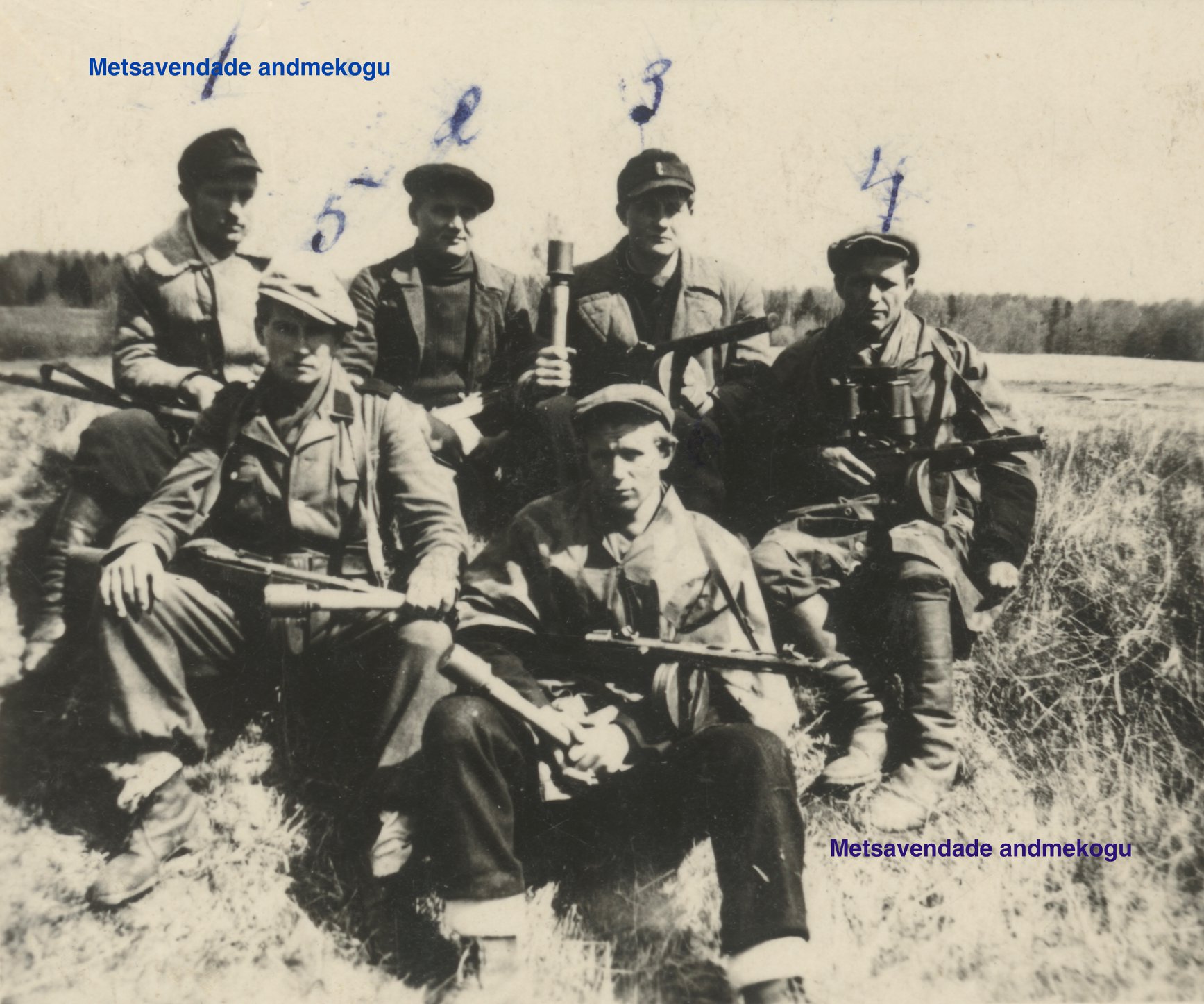 Jäädvustatud metsavennad ja neile külla tulnud Kalev Pomerants, istub vasakul, paremal istub E. Pruul. Taga seisavad vasakult E. Pomerants, A Tuut, P. Mäe ja E. Heinloo. Ülesvõte Muda küla metsas.;
