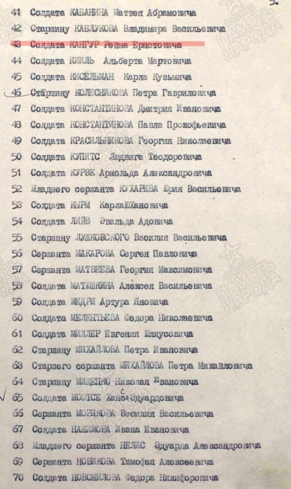 Kuulsuse ordeni III järk (568808) - autasustatuks 1926. aastal sündinud ja 1944. aastal Punaarmeesse võetud reamees Reinhold Kangur. Autasu annetatud 1947. aastal aga see on ka kahjuks kõik, mis Podvig Naroda välja annab. Mingeid täpsemaid dokumente seal tema kohta ei ole.