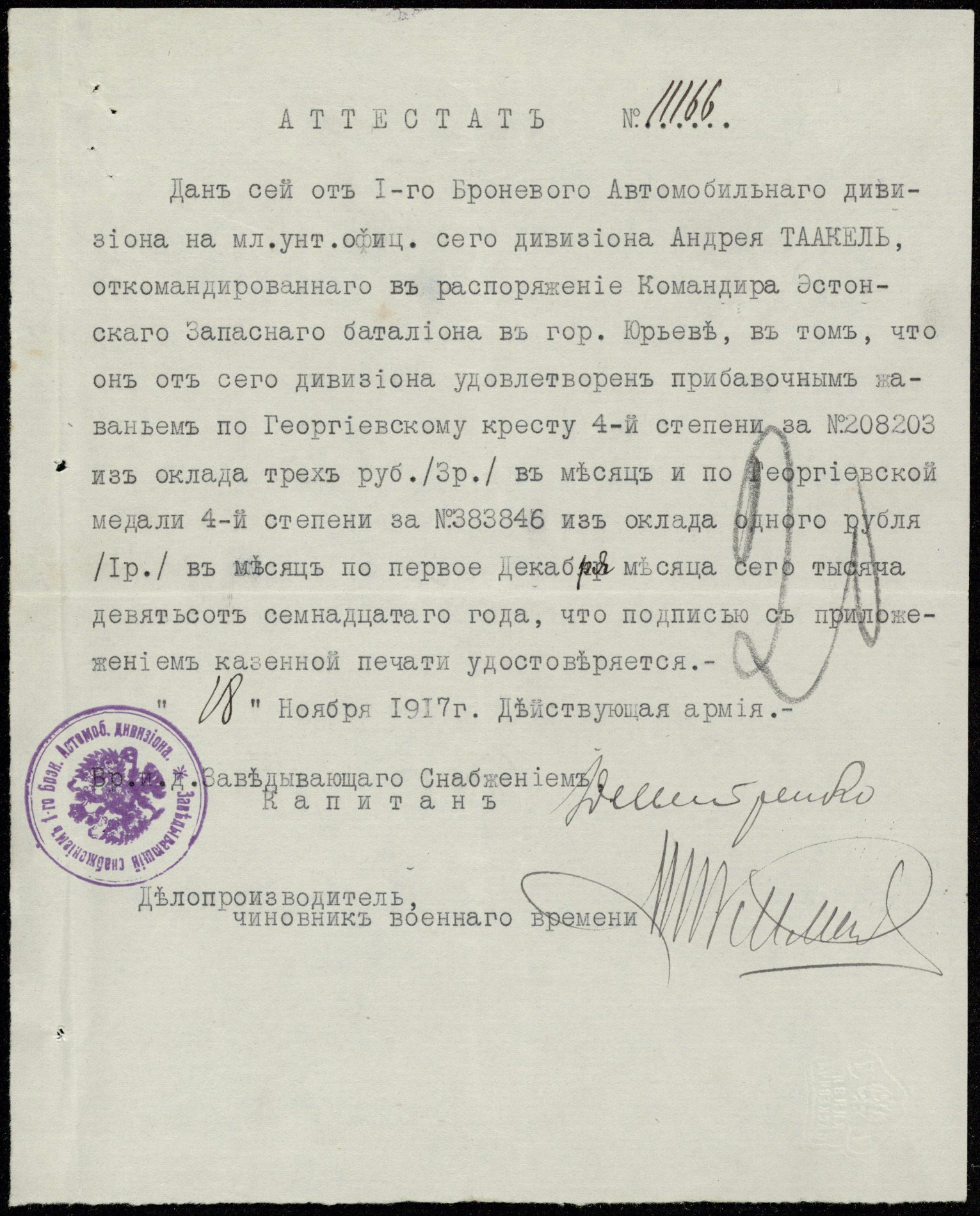 траншейных орудий, мл. унтер-офицер. Награжден 26.11.1916 по Высочайшему