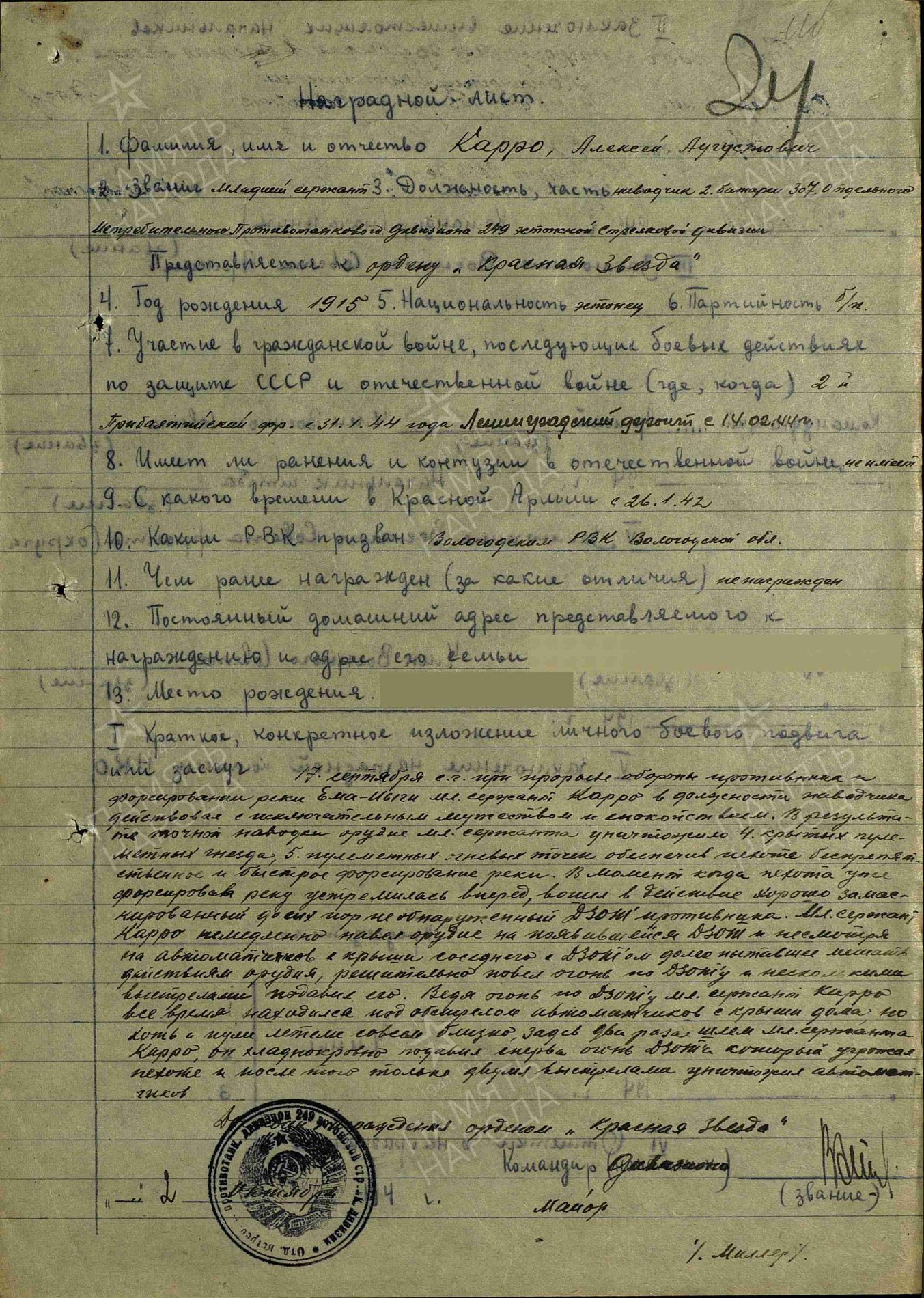 Nooremseersant Aleksei Karro, 249. Eesti Laskurdiviis, 307. Üksiku tankitõrjedivisjoni 2. patarei relvakomandör. Tehumardi lahingu eest saadud Isamaasõja 2. klassi ordeni nr. 268845 kavaler. Karro on saanud veel Punatähe ordeni nr. 1151824 (Emajõe forsseerimine septembris 1944.a) ja Kuulsuse III klassi ordeni nr. 464935 (Kuramaa lahingud).
