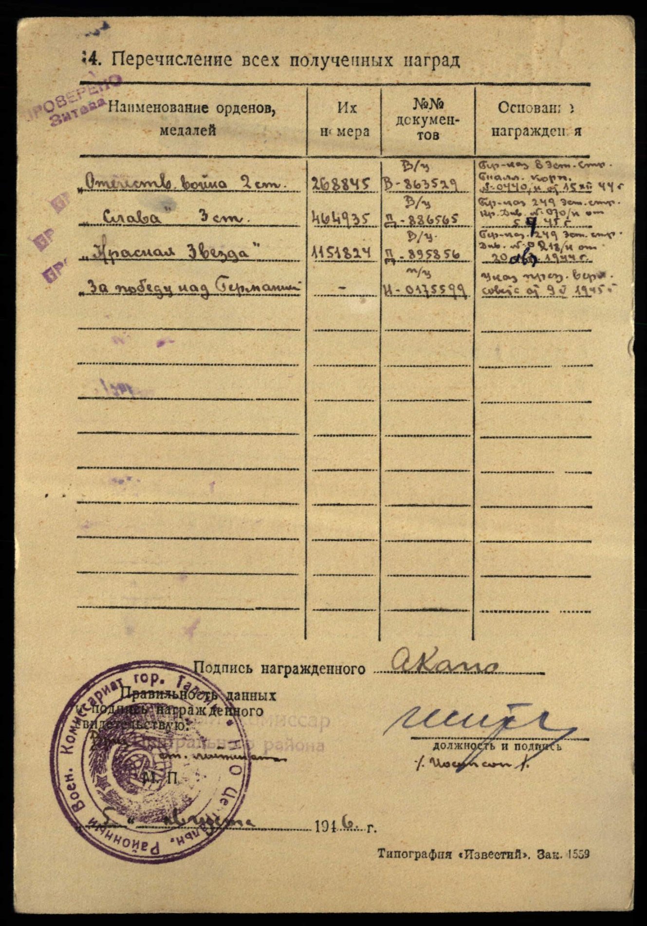 See orden on kunagi leidja poolt SIIA postitatud koos omaniku infoga, ekslikult märgitud siis autasu numbriks 464926. Koos Kuulsuse ordeniga leiti ka väikese numbriga (196897) Lahinguliste teenete eest medal.
