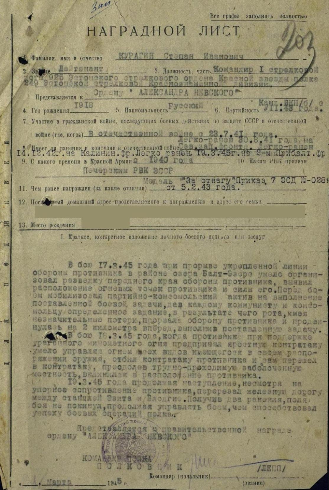 249. Eesti laskurdiviisi 925. laskurpolgu 1. laskurroodu komandör leitnant Stepan Kuragin. Aleksander Nevski ordeni nr. 20368 kavaler. Ordeniga autasustati teda Kuramaa lahingute eest. Fotod pärit ühest foorumist.