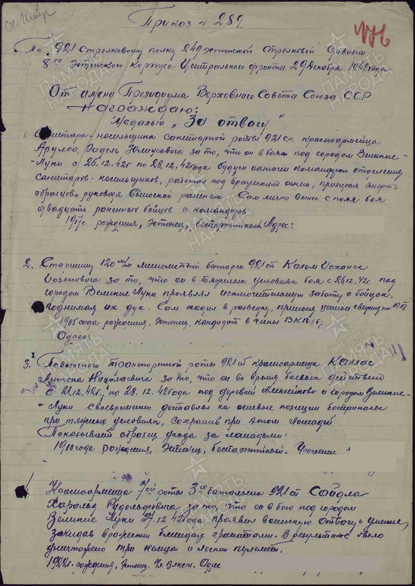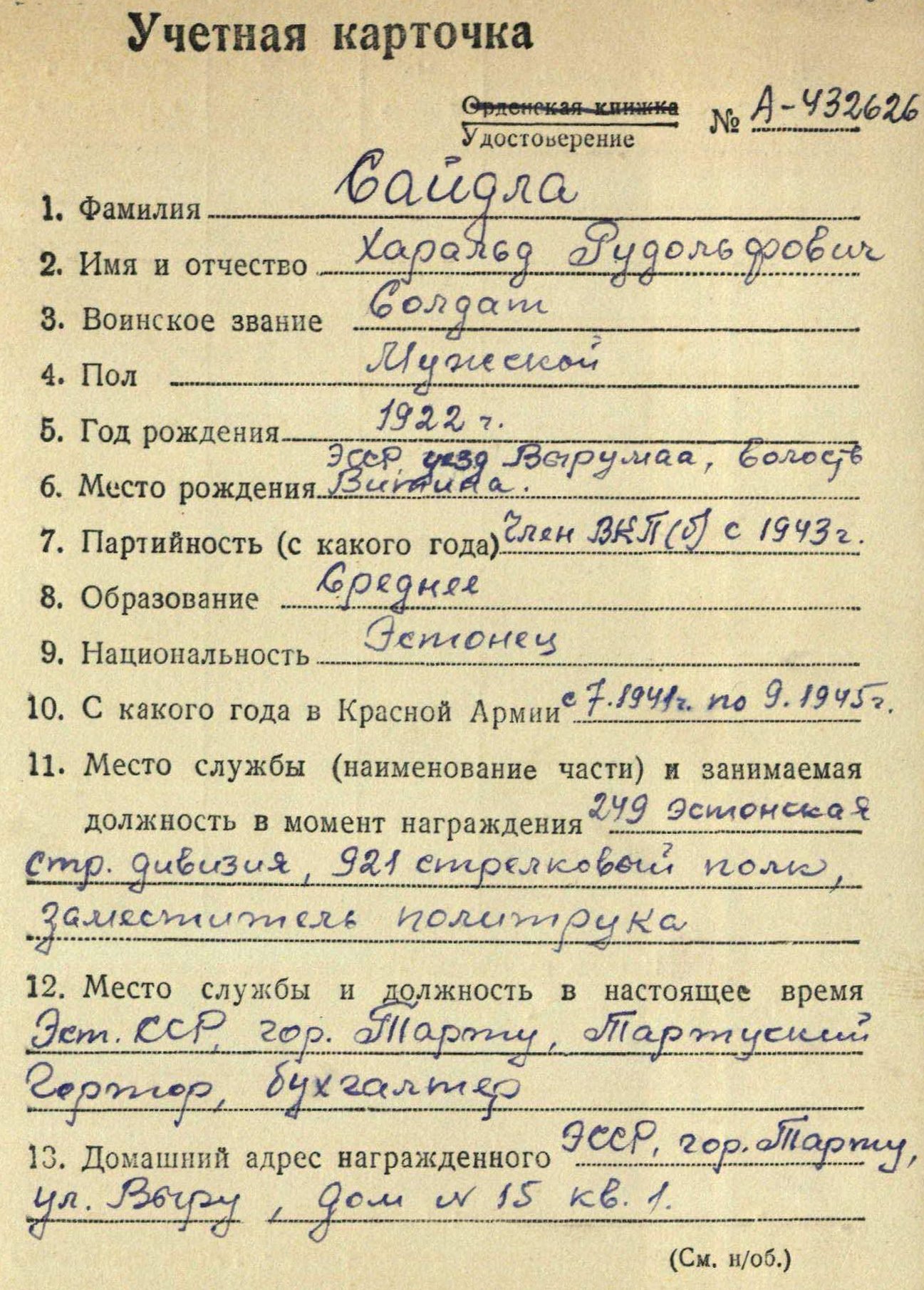 Selle Vapruse medali (135169) sain juba mõned aastad tagasi aga nüüd sai arhiivist ka taustainfo tellitud. Autasu on annetatud juba 1942. aasta 29. detsembril Velikije Luki lahingute eest 249. laskurdiviisi 921. laskurpolgu 3. pataljoni 7. roodu punaarmeelasele Harald Saidla'le. Autasustamislehel on kirjas, et 1942. aasta 27. detsembril hävitas ta käsigranaadiga vaenlase kuulipildujapesa, mille järel õnnestus pataljonil edasi liikuda. Pamyat Naroda ja Memento andmebaasides on kirjas, et Saidla on alates 1943. aasta 8. jaanuarist Velikije Luki juures teadmata kaduma jäänud. Samas on tema Venemaa arhiivist tellitud dokumendile märgitud, et astus 1943. aastal parteisse ja sõjaväes oli 1941. aasta juulist kuni 1945. aasta septembrini. Sai siis näiteks haavata ja lohistati mõne teise üksuse sanitaride poolt minema, mille tõttu loeti oma üksuses kadunuks. Võimalusi on ilmselt mitmeid, sest Luki all oli kõik nii segane.