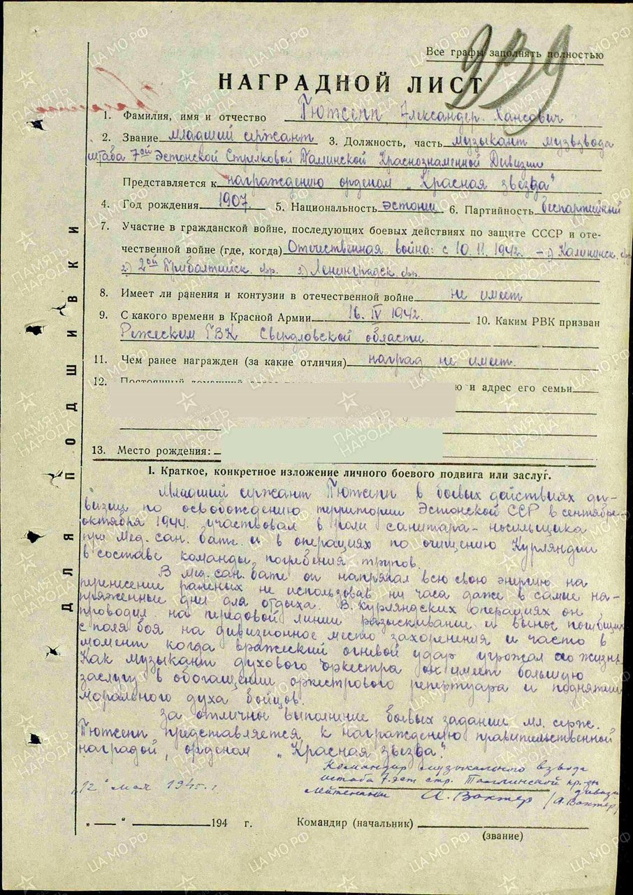 Punatähe ordenile esitas ta 1945.a kevadel muusikarühma komandör leitnant Artur Vahter, kes on samuti selles teemas siin täiesti olemas.