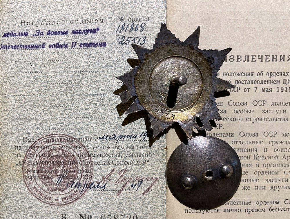 Eelmisel lehel näidatud alampolkovnik Uibo ordenitega samas karbis oli tegelikult veel üks väga huvitava looga Punatähe orden (2121871), mis annetati 1945. aasta juulis 8. ELK'i 63. tagavarapolgu suurtükidivisjoni staabiülemale, kapten Kristjan Veier'ile. Kuigi orden on annetatud 1945. aasta suvel on see antud tagantjärele 1941. aasta Porhovi ja Dno suvelahingute eest, mis teeb selle minu arvates väga huvitavaks. Nende lahingute ajal teenis kapten Veier 22. Eesti territoriaalse laskurkorpuse 614. suurtükidivisjonis patareiülema ametikohal. Uibo ja Veier'i abikaasad olid õed ja elati ühes majas, naaberkorterites. Ilmselt olid naised peale abikaasade surma meestest jäänud märgid ühte karpi kokku lükanud ja seetõttu need seal nüüd sedasi ühiselt avastamist ja leidmist ootasid.