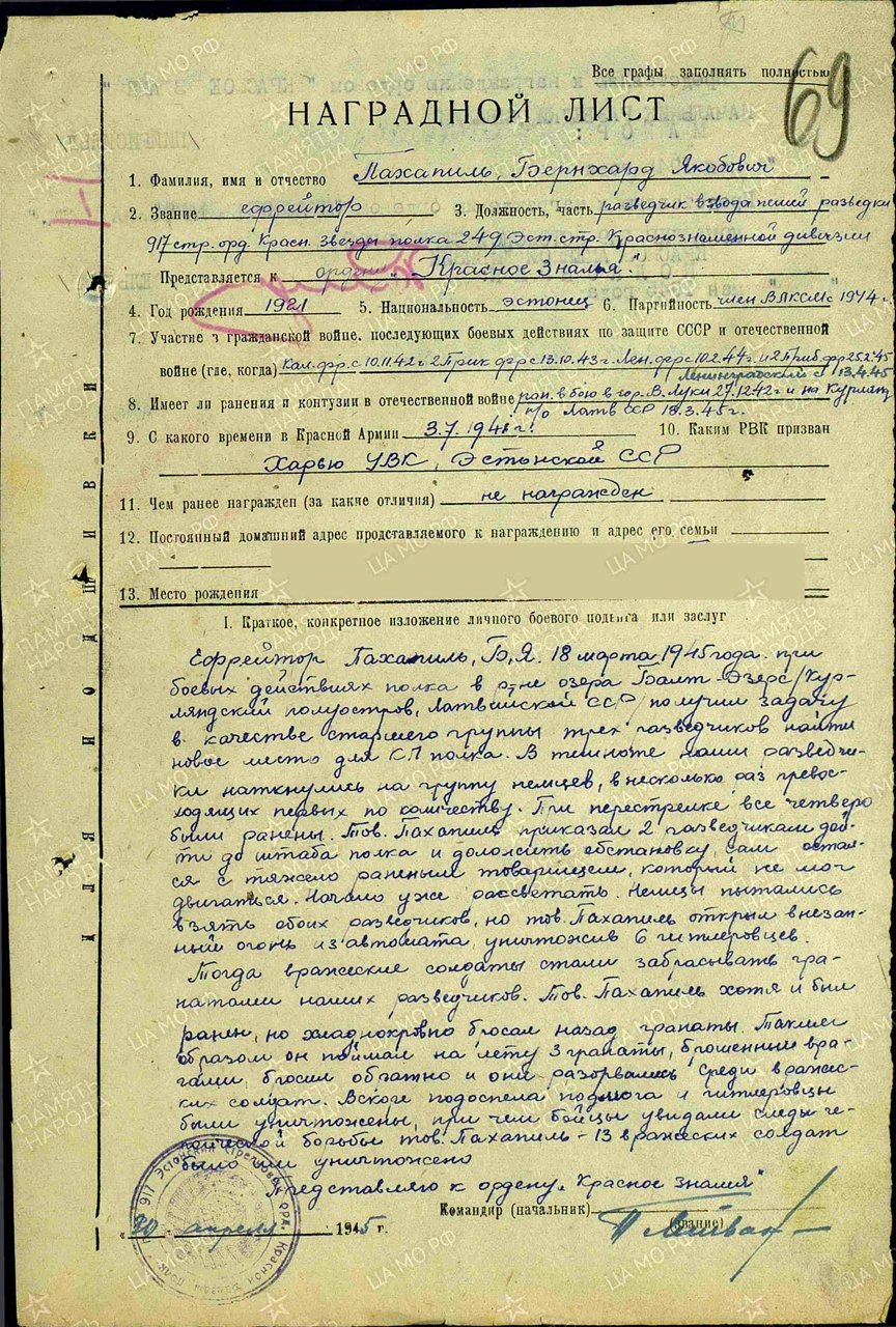Kaardiväeseersant Bernhard Pahapill, 249.Laskurdiviisi 917.laskurpolgu jaokomandöri abi. Isamaasõja I klassi ordeni nr. 68002 kavaler, mis oli ka Pahapilli ainuke lahinguautasu.