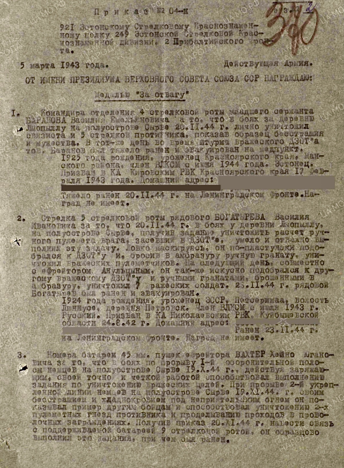 Huvitav, et ta esitati esmalt autasustamiseks Punalipu ordeniga, aga hiljem nii kõrgemal diviisi kui ka korpuse tasemel tõmmati sellele kriips peale.