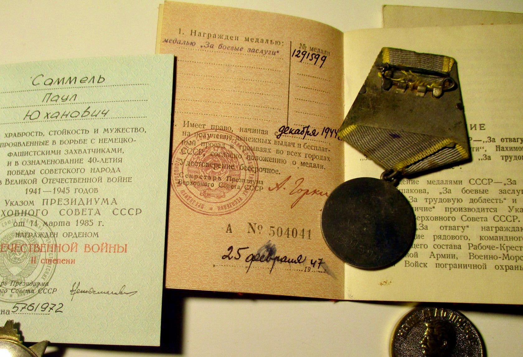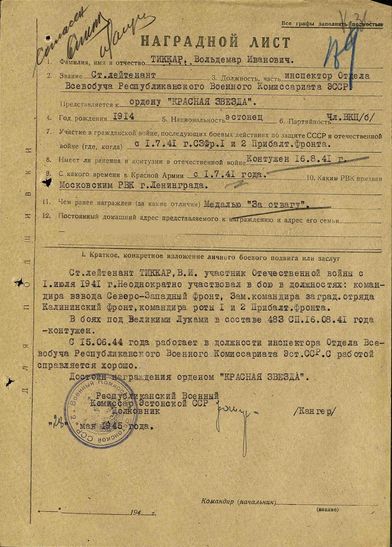 Vapruse medal nr. 135190 taust selgus- väga huvitav autasuleht ja üsna raske oli seda tõlkida, sestap võin mingites terminites eksida. Niisiis autasustatuks on nooremleitnant Voldemar Tikkar, 8.ELK üksiku tõkestusüksuse komandöri asetäitja. Vapruse medali nr. 135190 ja Punatähe ordeni nr. 2122883 (asukoht teadmata) kavaler.tossom kirjutas: ↑T Aug 12, 2025 9:58 am Siin ühe asjast huvitatud inimese kes väga internetis ei käi, pisuke kollektsioon. Sain seda osaliselt pildistada. Meile pakuvad sealt andmebaasi jaoks huvi: Punatähe orden nr. 1480360 ja ilmselt Velikije- Luki ja Saaremaa lahingute eest antud Vapruse medalid 135190 & 1732552.