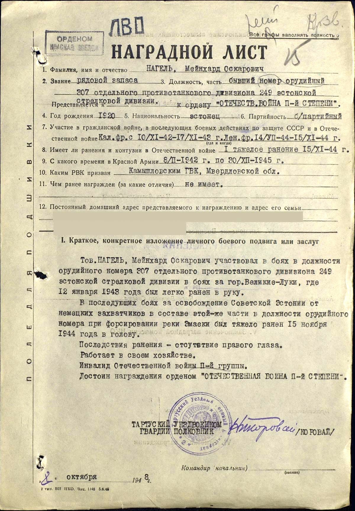 249. Laskurdiviisi 307. üksiku tankitõrjedivisjoni reamees Meinhard Nagel, Punatähe ordeni nr. 3004625 kavaler. Punatähega autasustatud peale sõda ja seda kergema haavatasaamise eest Velikije- Luki lahingus ja raske haavatasaamise eest Eestimaa pinnal toimunud lahingutes, Emajõe forsseerimisel 1944.a novembris.