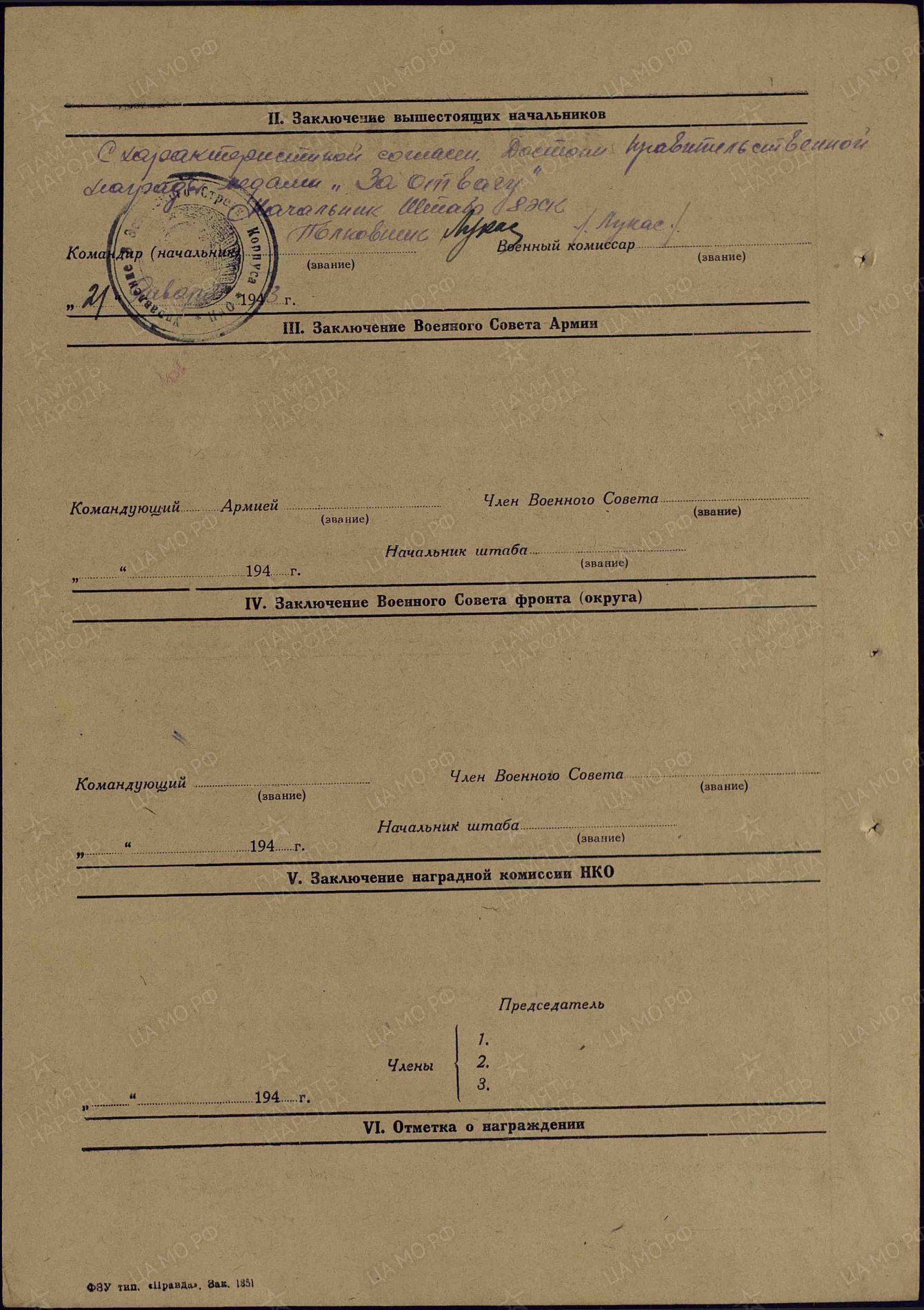 Lahingus 07.10.1944 Saaremaal Räägi? Küla juures miinipildujaüksuse komandörina vaenlast märgates võttis esimesena sisse tulepositsiooni ja oskusliku tulejuhtimise tulemusena hävitas vaenlase kuulipilduja.