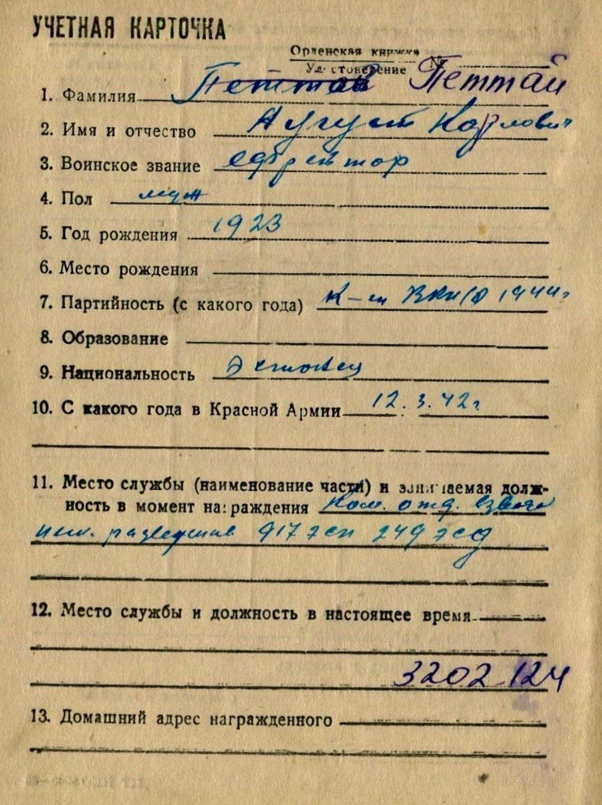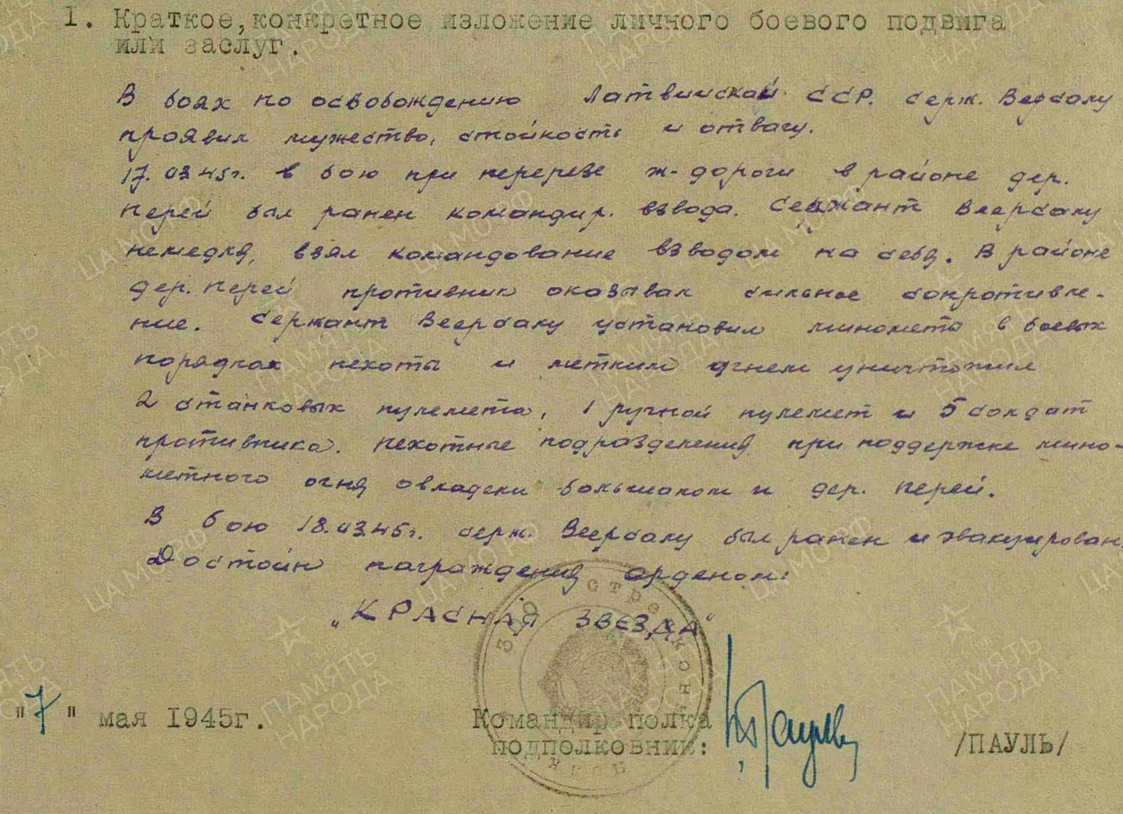 Sai tuvastatud, orden on annetatud Kuramaa lahingute eest 8. ELK'i 7. laskurdiviisi 300. laskurpolgu seersandile Herbert Veersalu'le. Käsikirjas kirjutatud teksti lugemisel ja tõlkimisel jäi ChatGPT hätta ning oleks hea kui keegi tore inimene lühidalt ära tõlgiks, mille eest see talle täpselt annetati.