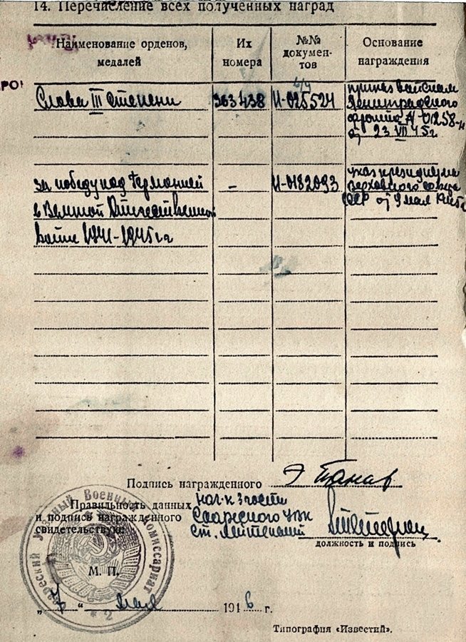 Lahinguliste teenete eest medal (800602) annetati talle 1944. aasta 17. veebruaril ja Punatähe orden (1147065) 1944. aasta 4. detsembril.