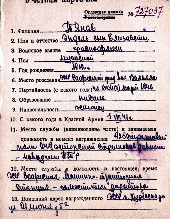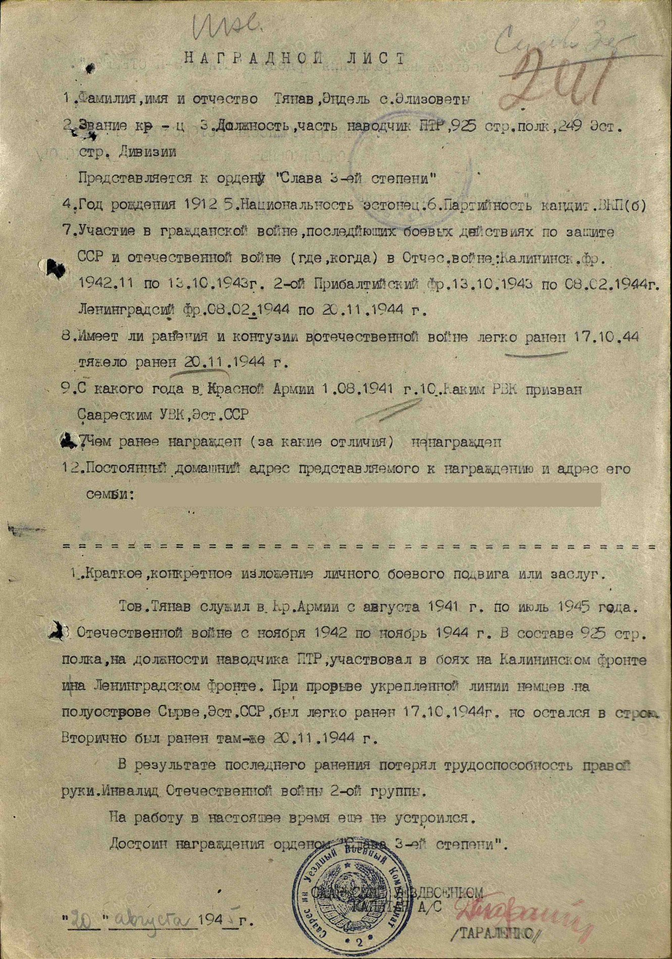 249. laskurdiviisi 925.laskurpolgu tankitõrjepüssi sihtur, punaarmeelane Endel Tänav. III järgu Kuulsuse ordeni nr. 363438 kavaler.