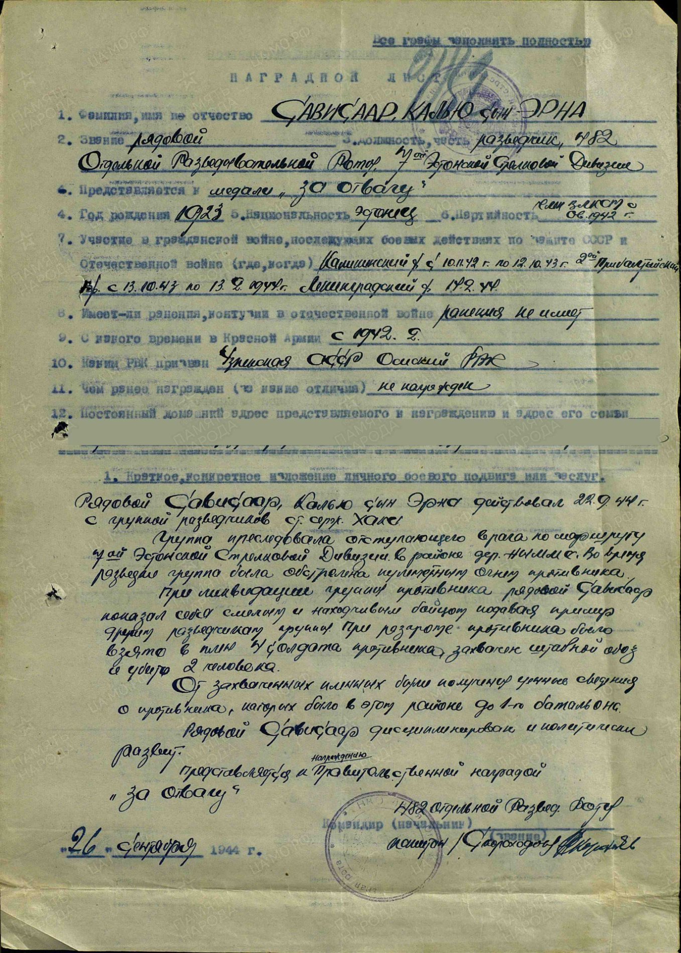 22. Septembril 1944, Nõmme külas, isiklikult hävitas 2 vaenlase sõdurit ja võttis vangi 4.