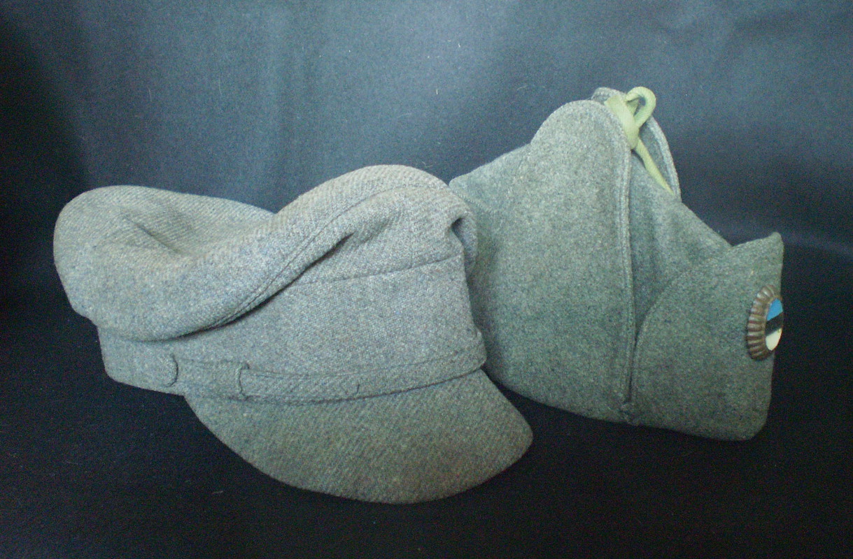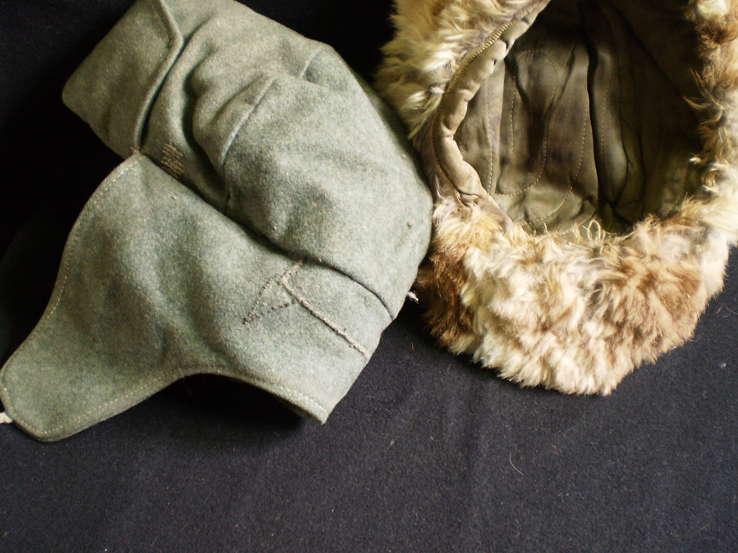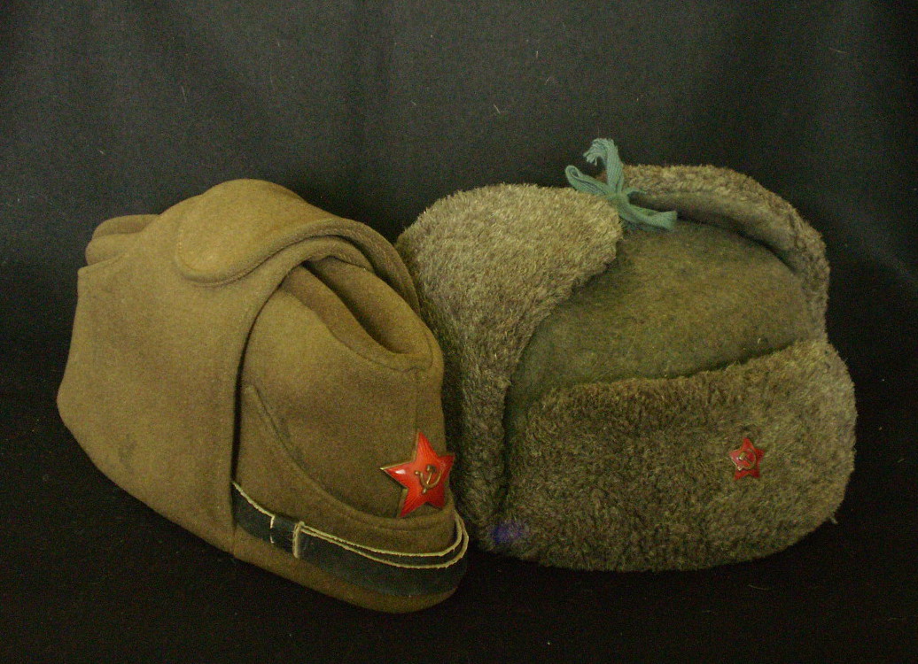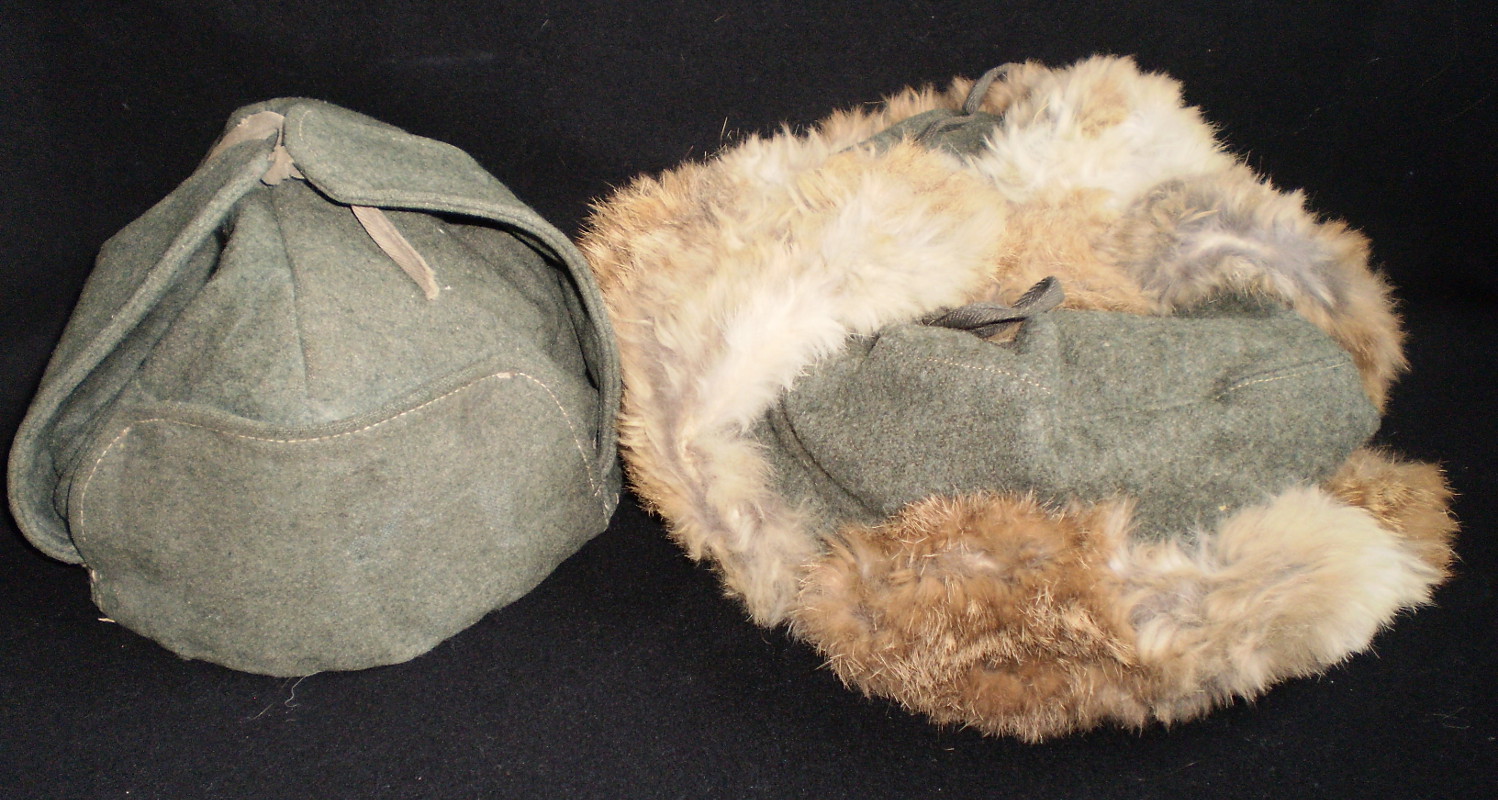 Vasakul ss sinelist tehtud vene ushanka stiilis talvemüts. Ära harutatud kotka tiiva õmblus on vasakul klapil näha. Paremal tüüpiline määrustikupärane talvemüts jänesenahst. Aasta paistab olevat sees 1942.