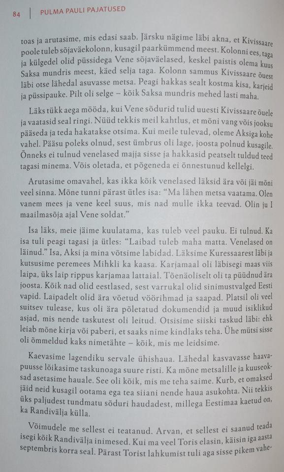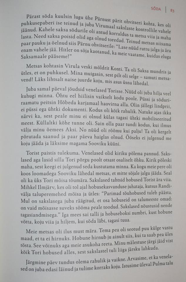 Aga kui uut informatsiooni tuleb, peaks selle vormistama. Ma ei taha lubadusi välja käia, aga täiendada tahaksin Võrumaal Määritsa lahingu lugu. Metsavennad panid seal 1. aprillil 1946 lahingu ajal aknast sinimustvalge lipu välja, keeldusid alla andmast ja langesidki põleva talu rusudes.