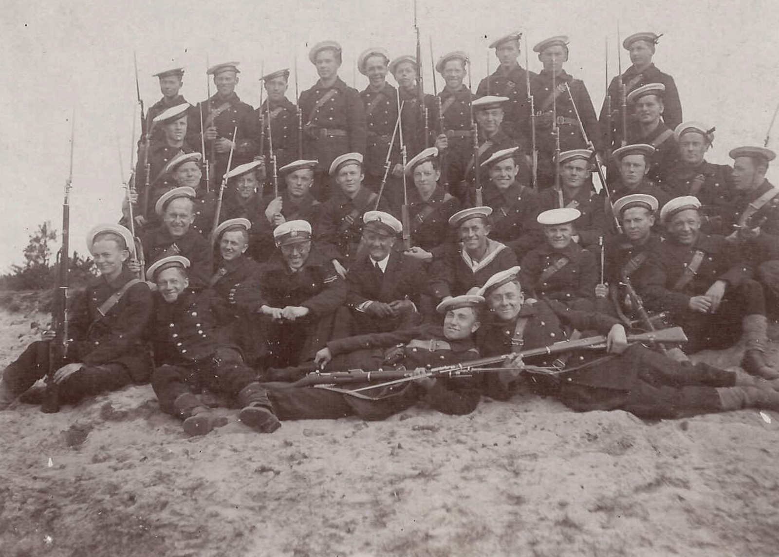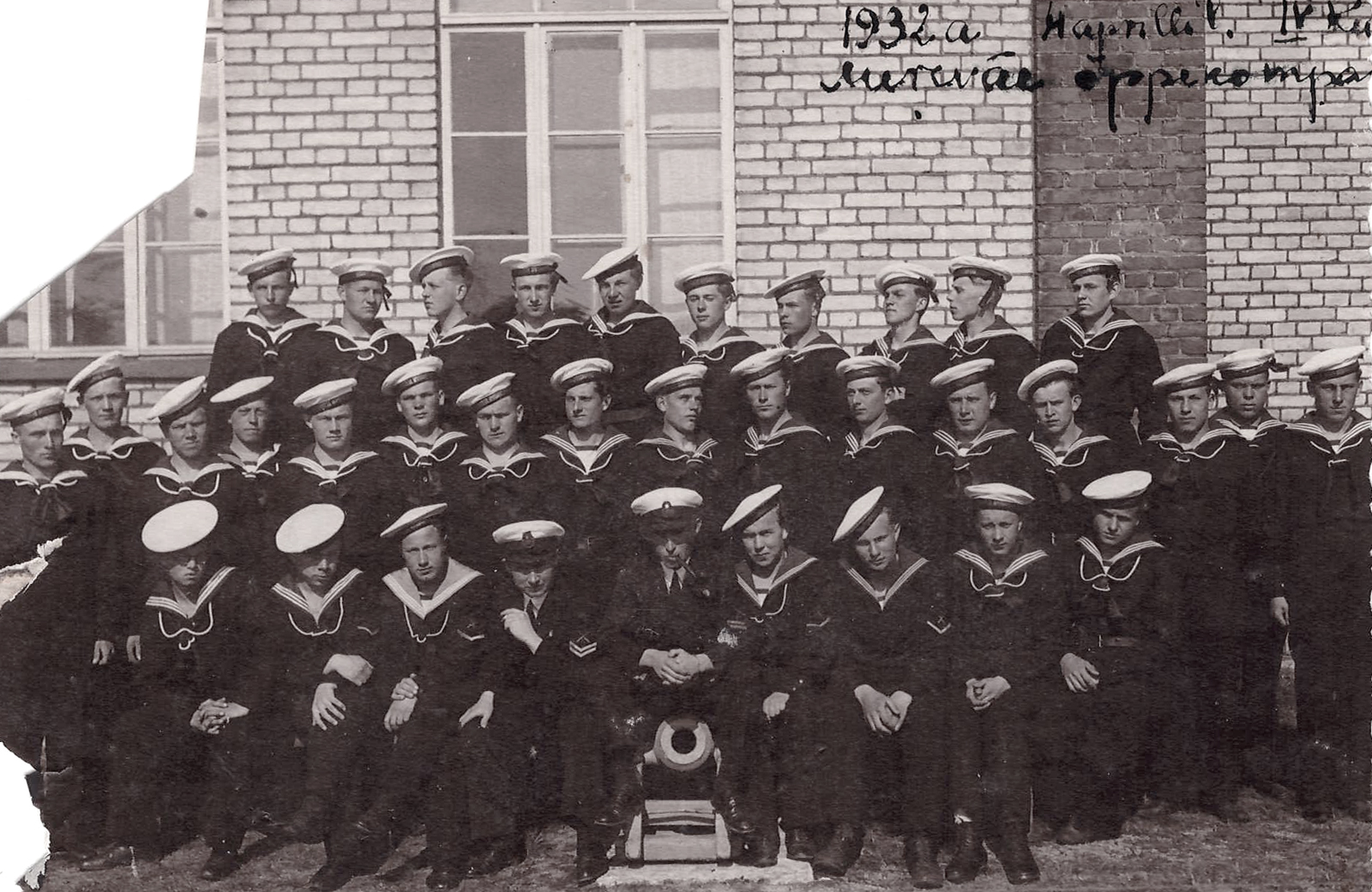 EW mereväelaste rivistus.jpg - Aegna MK, riviõppus 1938. aastal - pole 100% kindel aga esimese rea vasakult esimene võiks olla Vassili Männi, natuke häirib see ohvitseri mütsimärk tema mütsi eest, sest V. Männi oli veltveebel.