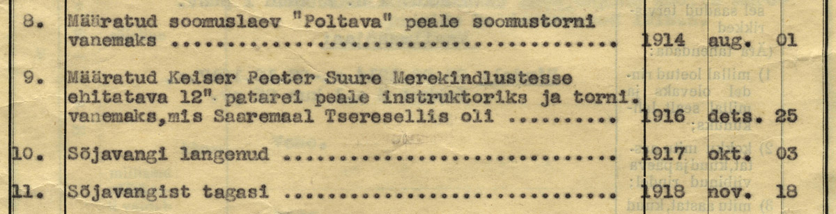 J. Feldmann'i teenistuslehel on ära märgitud ka sõjavangi langemine, 03.10.1917 (vkj) = 15.10.1917 (ukj).