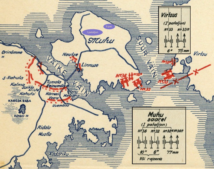 Kaardil on näha Suure-Väina lõunapoolset sissepääsu kaitsnud Muhu ja Virtsu rannapatareide asukohad ja patareides olnud suurtükid.