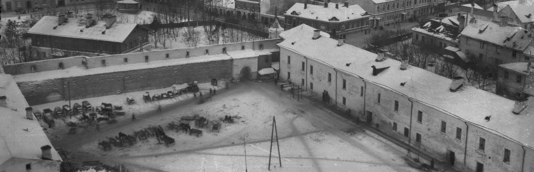 Pildistatud 1920. aastate alguses Hermanni kindluse hoovil valge hoone ees, taustal paistab Jaani kiriku torn.