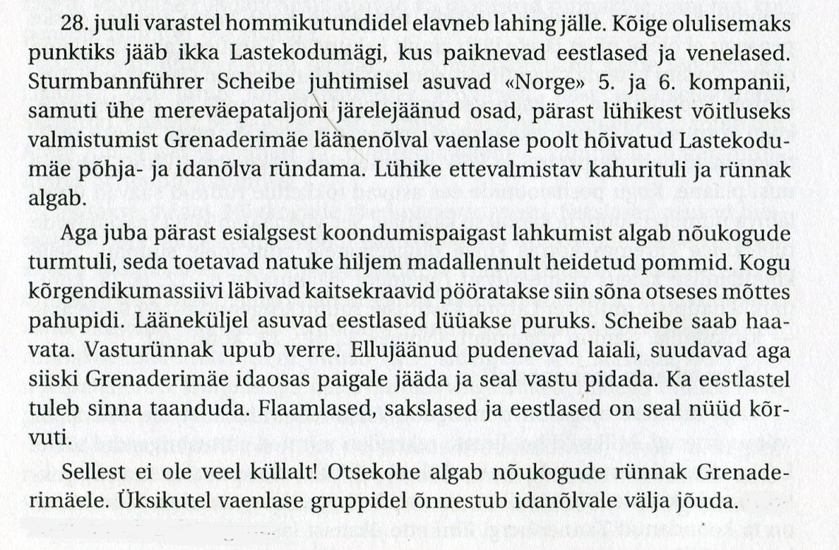 "Keskel oleva Grenaderimäe ehk Põrguhauamäe ja läänepoolse kõrgustiku ehk Tornimäe positsioonidele asusid eestlaste üksused (47. rügemendi III pataljon) ja kaks "Nordland" pioneerikompaniid (24. rügement).".