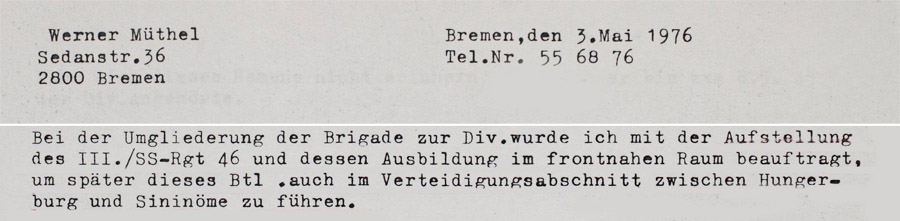 Leidsin sealt samast Põldma materjalide juurest nüüd ühe 1976. aastal Werner Mütheli'i poolt saadetud kirja. Kirjutab seal, et teda määrati 46. rügemendi III pataljoni korraldama ja väljaõpet läbi viima. Hiljem juhtis sama pataljoni tõrjelahingutes Narva-Jõesuu ja Sininõmme vahelisel lõigul.