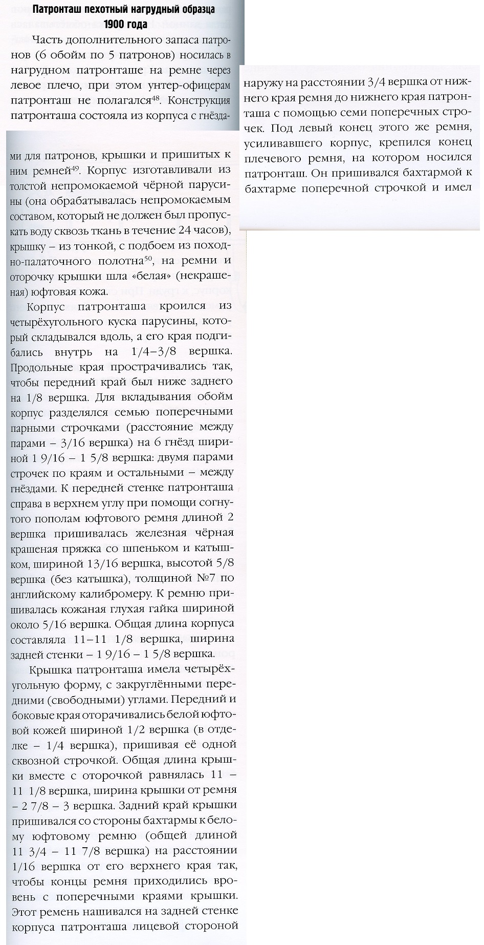 Tsaariväes kasutuselolevad nahaga kanditud taskud (1900. aasta mudel) mahutasid 6 padrunipidet, uus presendist tasku aga 2 korda rohkem. Samuti loobuti naha ja valgevase kasutamisest. Padrunitaskud valmistati immutatud purjeriidest (presendist), pandlad rauast.