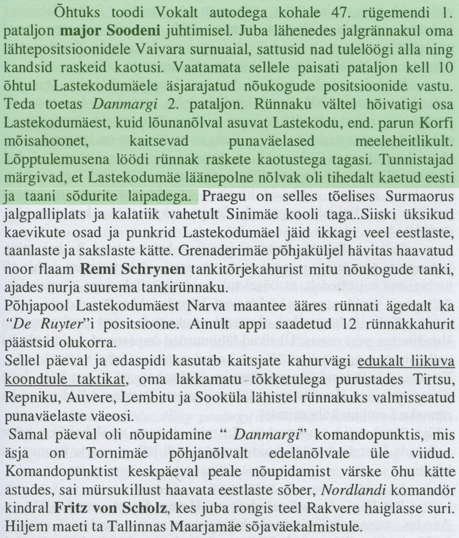 Kui kahurituli tunduvalt hõrenes, möödusime esimesest mäest, kus venelasi polnud ja ründasime Vaivara lastekodu kandist teist, Grenaderimäge, kust vastase välja lõime. Kohati tekkis käsitsivõitlus. Selle päeva lahing oli küll lõppenud, kuid veel õhtul kella poole 10 paiku juhtus kurb õnnetus. Juhusliku miini killust sai surmava haava kõhtu meie populaarne ülem major Sooden.