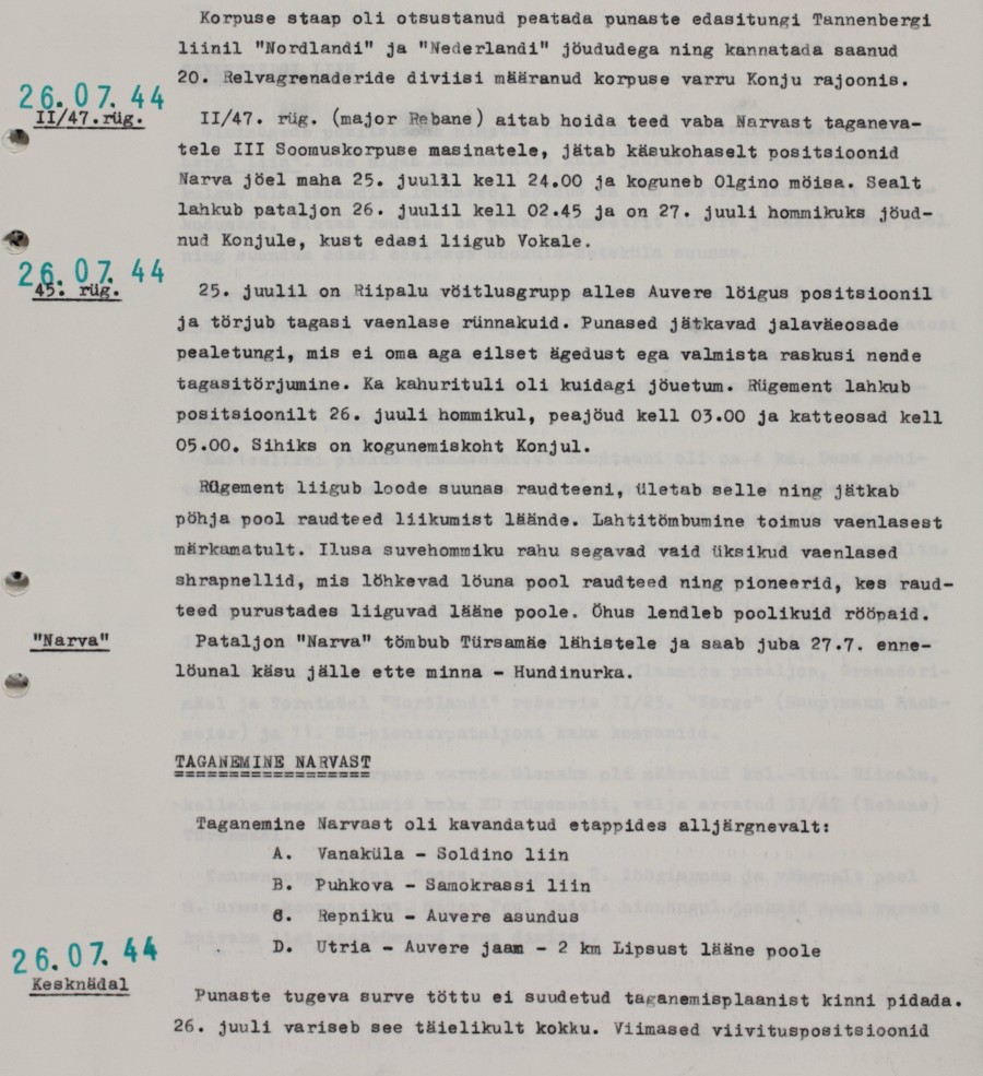 26. juuli hommikuks kell 8.00 on kõik 109. laskurdiviisi allüksused toimetatud Narva jõe läänekaldale ja alustavad edasiliikumist.