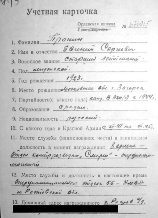 8. Armee 268. üksiku trahviroodu vastuluure osakonna SMERSH vanemleitnant Pronin