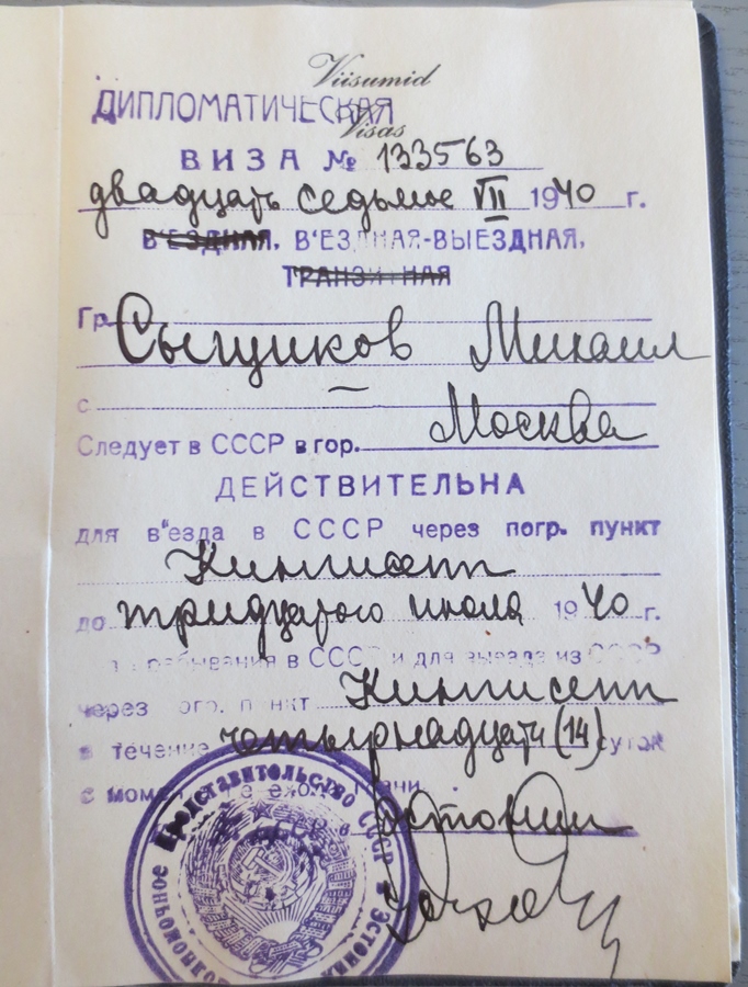 Piltidel on delegatsiooni liikme Mihhail Sõstšikovi diplomaatiline pass sõiduks NSV Liitu. Mihhail Sõstšikov oli Riigivolikogu II koosseisu (hilisem ENSV Ülemnõukogu I koosseis) liige, valitud Riigivolikokku 29. valimisringkonnast mis asus Petserimaal. Arvestades, et delegatsioonis oli kokku vaid 21 liiget, on tegemist väga haruldase esemega. Rääkimata selle diplomaatilise passi ajaloolisest väärtusest.