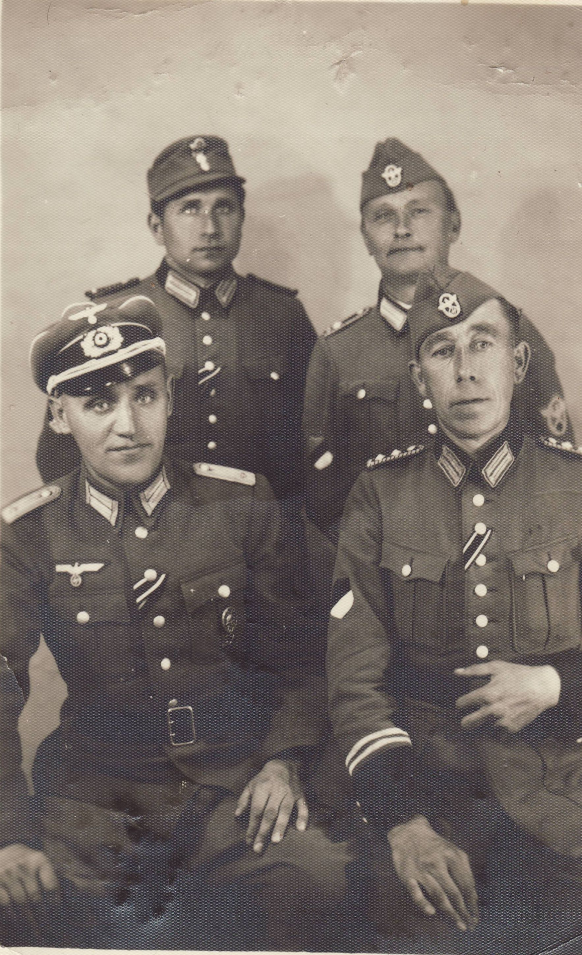 Manuses olev pilt on tehtud aastal 1942. Esireas on leitnant Allert ja minu vanaisa Gustav Veesmann (Kusta Rannik), kella auaste peaks olema Oberfeldwebel.