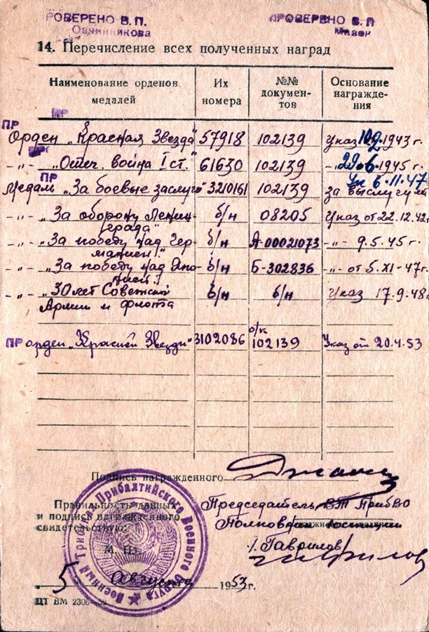 Balti sõjaväeringkonna sõjatribunali esimehe asetäitja, justiitspolkovniku Pjotr Dzanumovi Isamaasõja orden I klass nr. 61630. Mille eest ta selle konkreetselt sai, ei õnnestunudki kahjuks hetkel välja uurida.