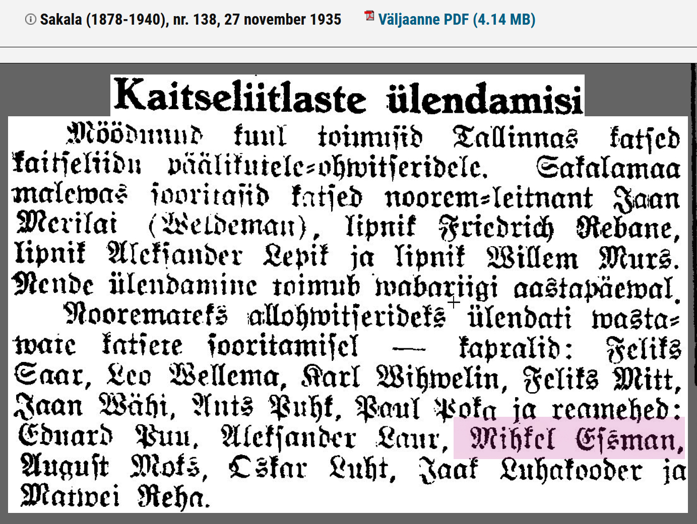 Risti saamine ei pruugi sugugi liikmelisust tähendada. Näiteks tänases Eestis võidakse Valgerist anda ka lihtsalt tublile toetajale ning ma kipun arvama, et EW ajal kehtis sama raamistik.uscha kirjutas:Mihkel Esman on saanud 1939. aasta veebruaris Kaitseliidu Valgeristi, mis tähendab et ta oli KL liige.