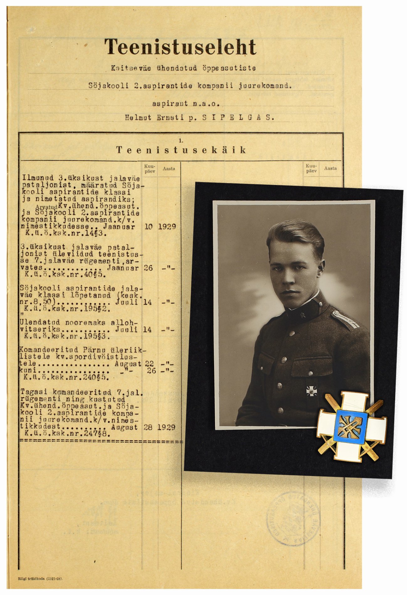 Eelmisel fotol ülemise rea keskmine märk kuulus 1929. aastal Sõjakooli aspirantide jalaväeklassi lõpetanud Helmut Sipelgasele.