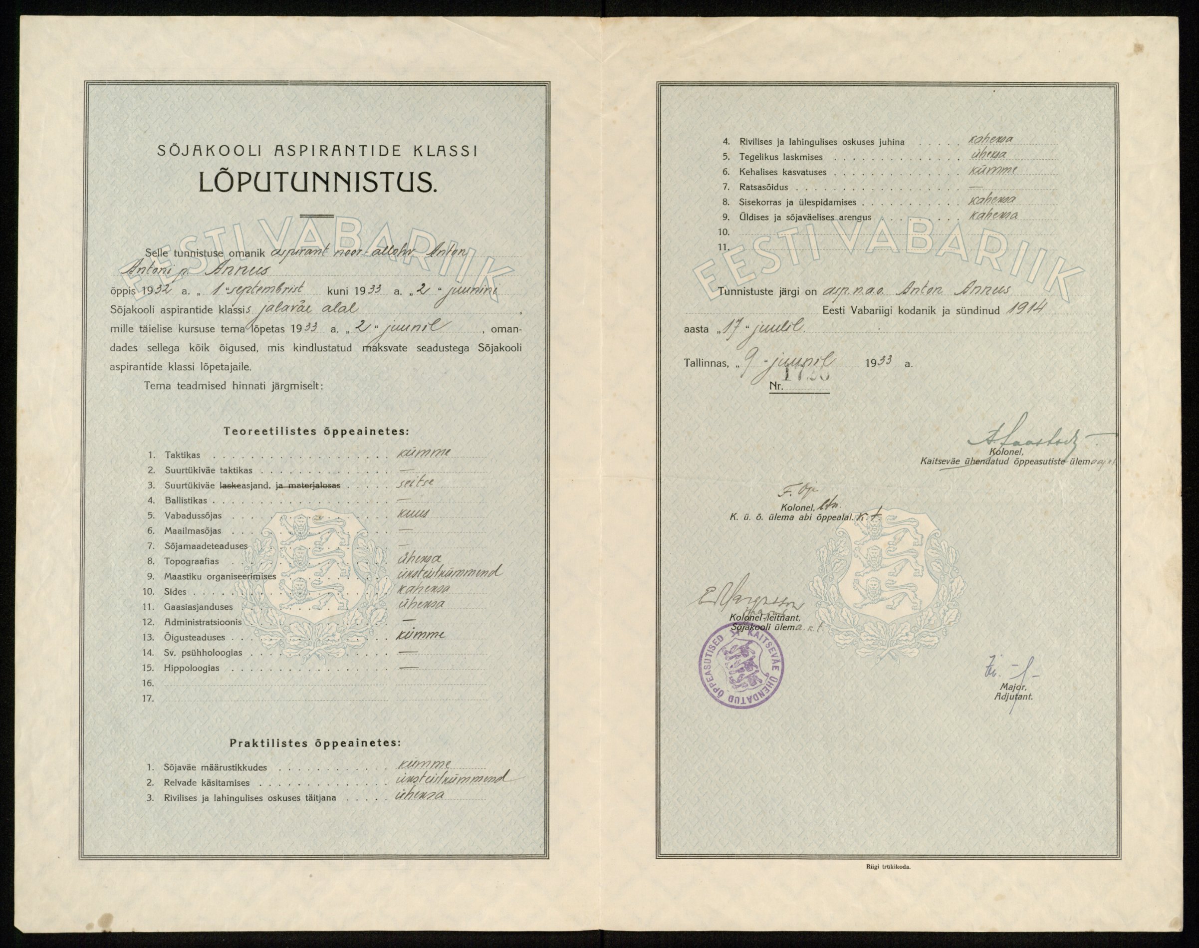 Omal on kogunenud mõned aspirantide kursuse ja allohvitseride kooli lõpumärgid.