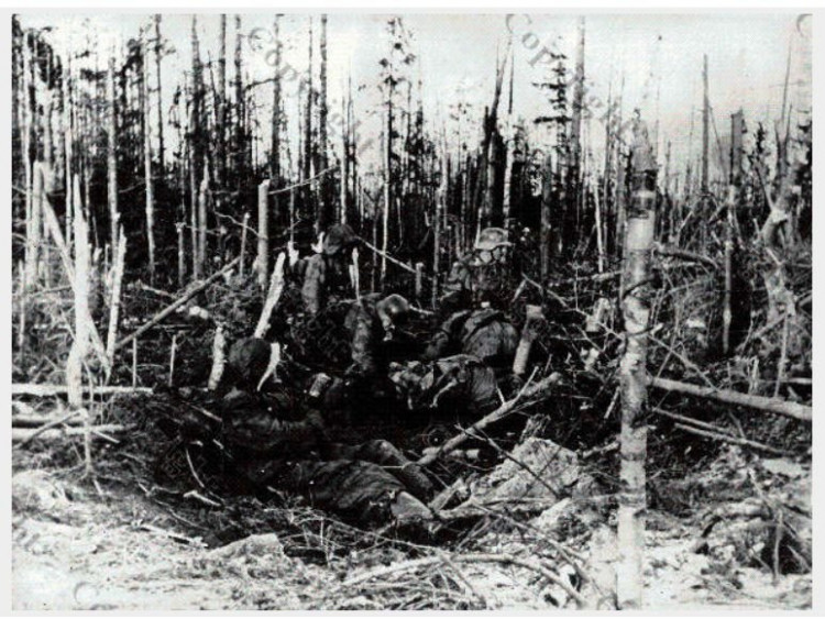 Sturmgeschütze haben die Waldschneise besetzt. Das Tagesangriffsziel ist erreicht. Im sumpfigen Waldgelände beziehen die Grenadiere ihre Verteidigungsstellungen für die Nacht, um am nächsten Morgen erneut zum Kampf anzutreten.