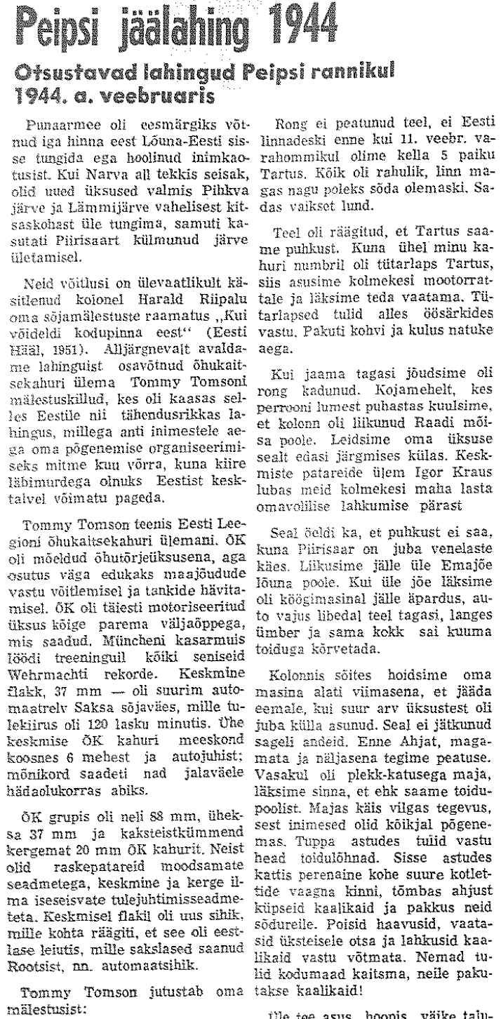 Siis veel keegi Raivo Tuulemaa (võib-olla varjunimi) 1. patareist (Vaba Eestlane. 19., 22. ja 26.02.1958). Ajaliselt distantsilt kõige lähemal ja justkui kõige detailsemad, aga paraku vist ka kõige ilukirjanduslikumad. Jutt uuest pealetungilainest hommikul pole usutav.